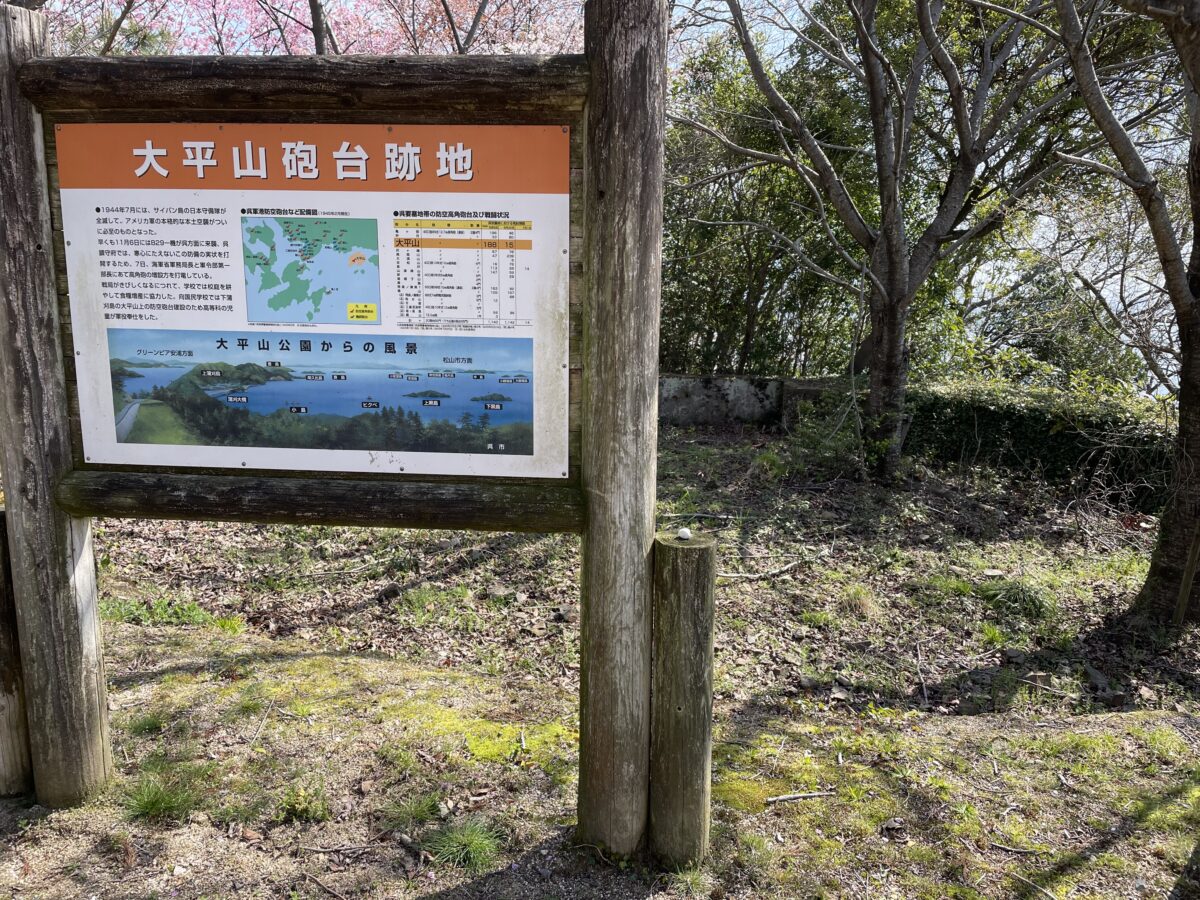 大平山の頂上には、戦時中砲台があり、今でも当時の面影を残しています。桜並木が続く道を登っていくと突然現れます。