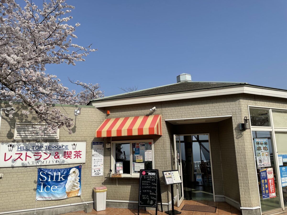 庭園の一番奥にはレストラン&喫茶は、テラス席からの眺望がとても素晴らしく、桜の花と広大な青い海を眺めながらお食事が出来ます。
