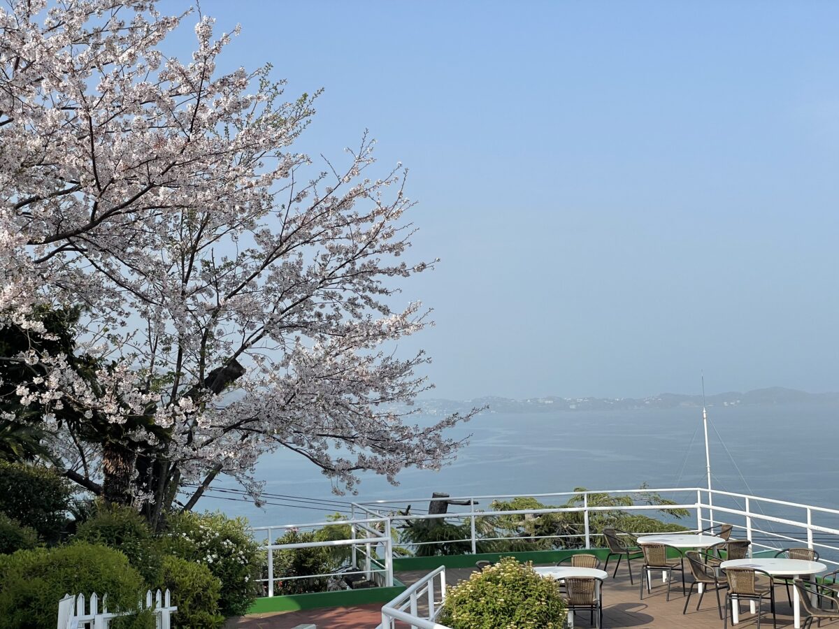 庭園の一番奥にはレストラン&喫茶は、テラス席からの眺望がとても素晴らしく、桜の花と広大な青い海を眺めながらお食事が出来ます。