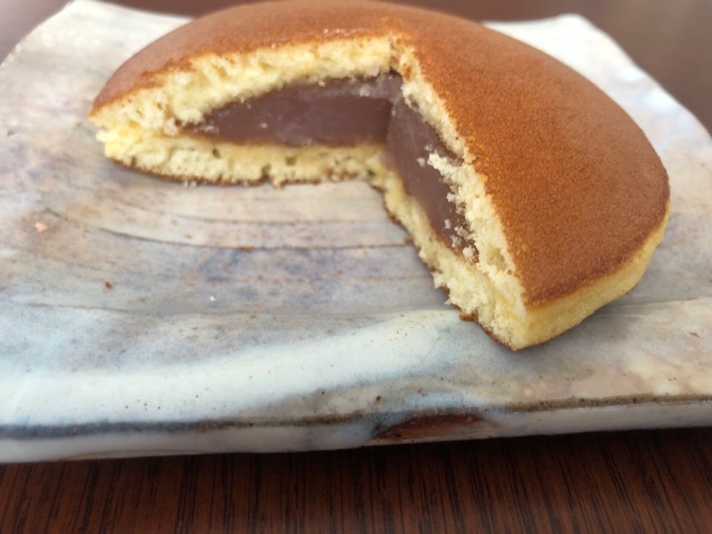 こちらはドラえもんが好きそうなまん丸のどら焼きの風情、中身は桜餡と言うことで、ほんのりと桜色が感じられます。