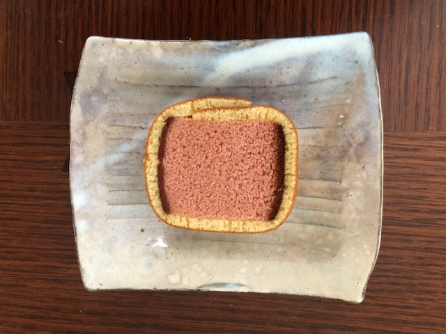 さくらバージョンは、真ん中はピンクの生地ですが両側にあんこが忍ばせてある模様。中の桜風味のカステラは、さくらカステラとほぼ同じですが、巻いてある茶色い生地が少し固め。甘さがさくらカステラより少し控えめな気がしました。