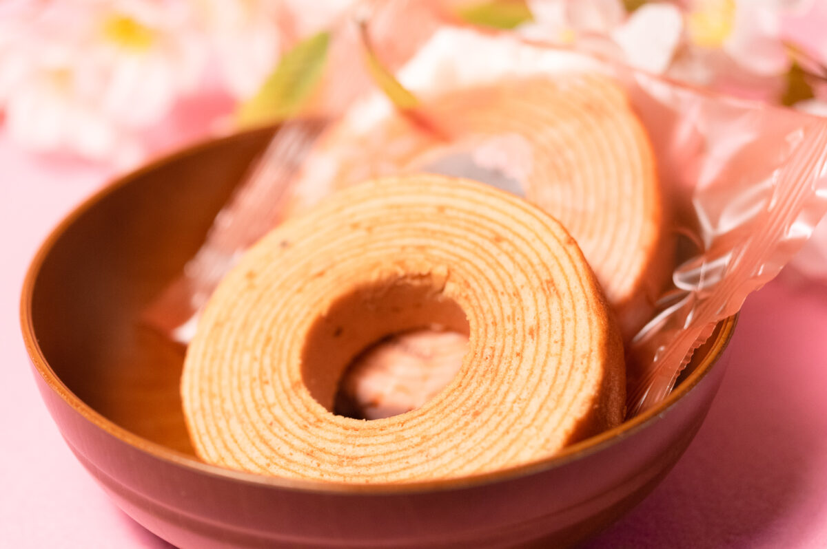 しっとりとしながらも、しっかりと焼き固められたバウムクーヘン。芳醇なバターの香りと、ふわっと優しく包み込む桜の香りが楽しめます。桜のフレーバーはそれほど強くないものの、上品な甘さとほんのりとした桜花の塩味の組み合わせが、春の暖かい陽気を感じられます。