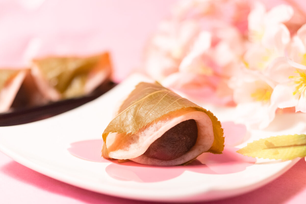餡をクレープのような生地で巻いた関東風の桜餅。店頭には関西風の桜餅もあります。関西風の桜餅はひな祭りの記事で紹介しておりますので、よろしければ合わせご覧ください。