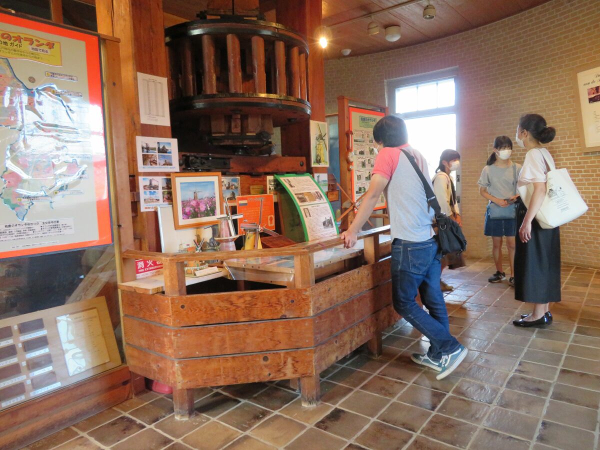 コスモスの畑を散策するばかりでなく、オランダ風車の中に入ることもできます。中心には大きな羽根を動かす歯車がゆっくりと回転し、外壁の窓はコスモスの花畑を縁どります。