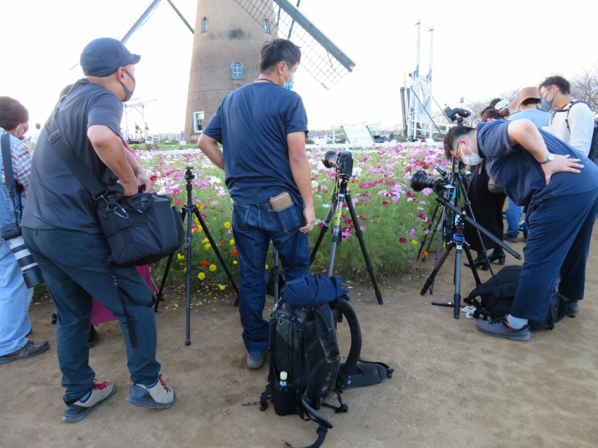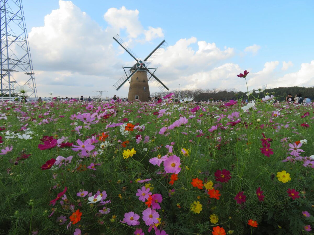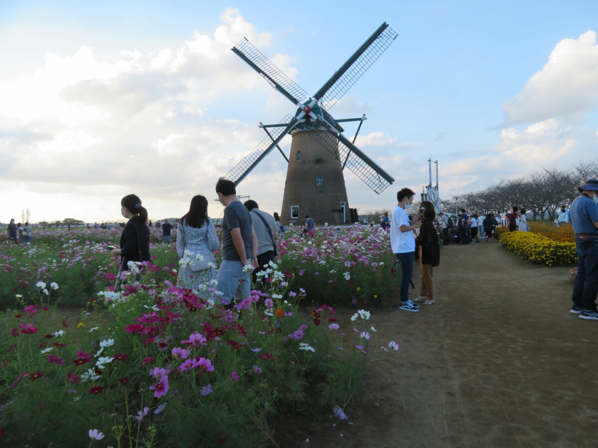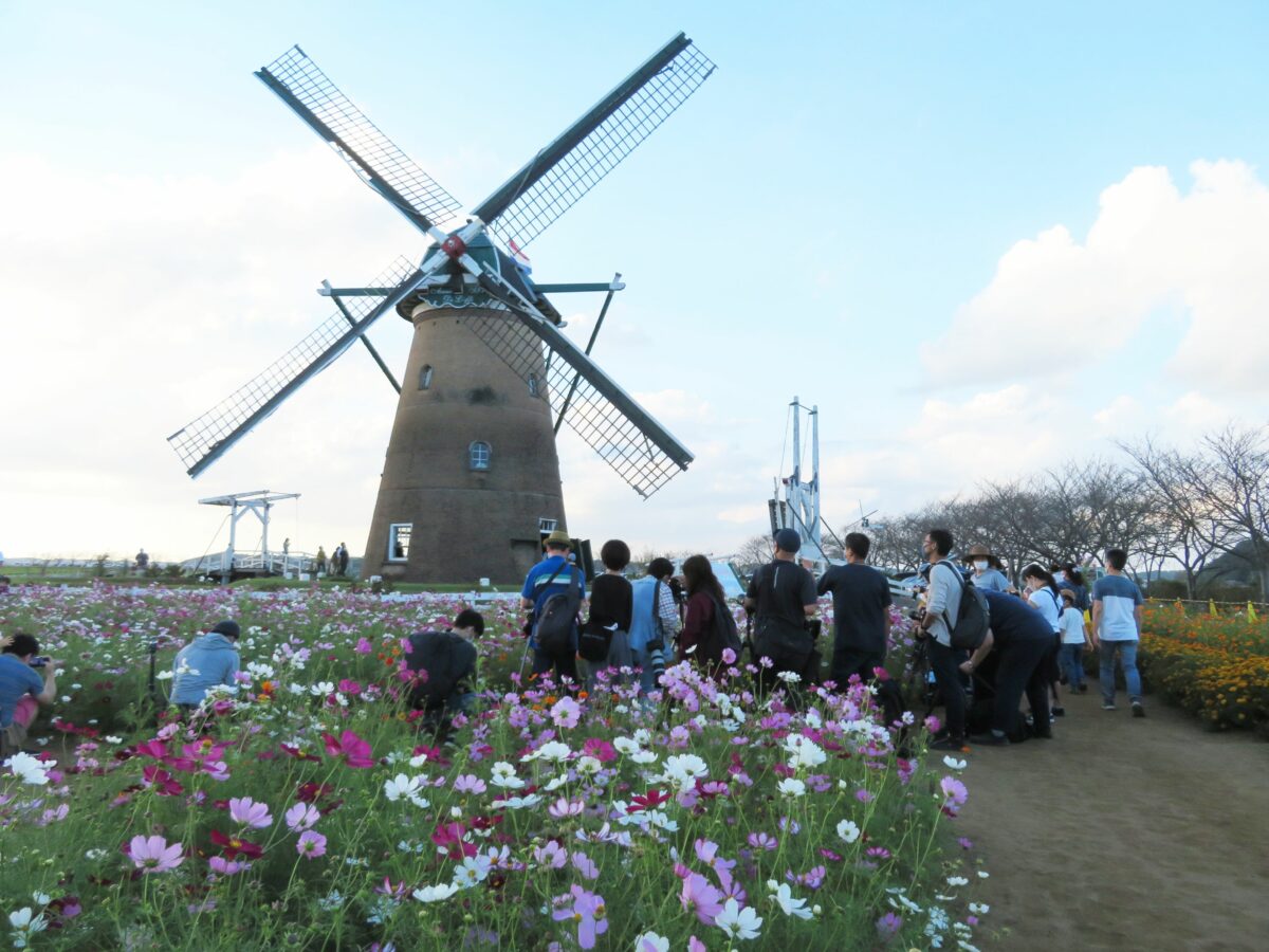 オランダ風車を背景として重なり合うコスモスの花が見事なので、衝動的にカメラのシャッターを押してしまうことでしょう。カメラスポットは、フォトジェニックな写真を撮影しようとする人で混み合います。