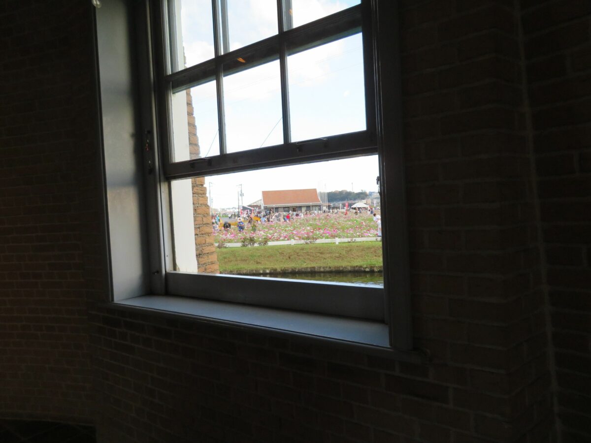 オランダ風車「リーフデ」の窓外に広がるコスモスの花畑
