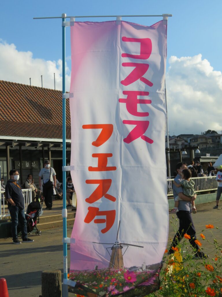 「佐倉コスモスフェスタ」の幟が立つ佐倉ふるさと広場の入口