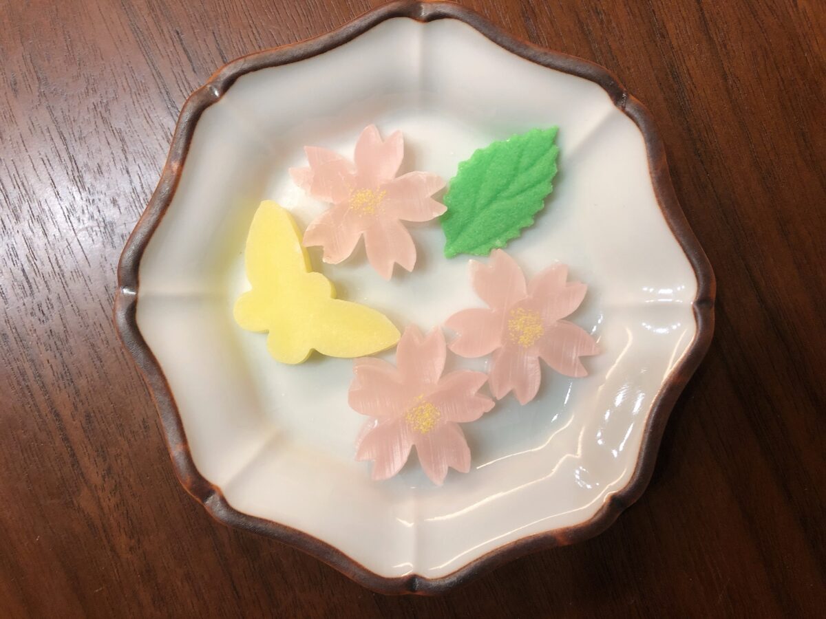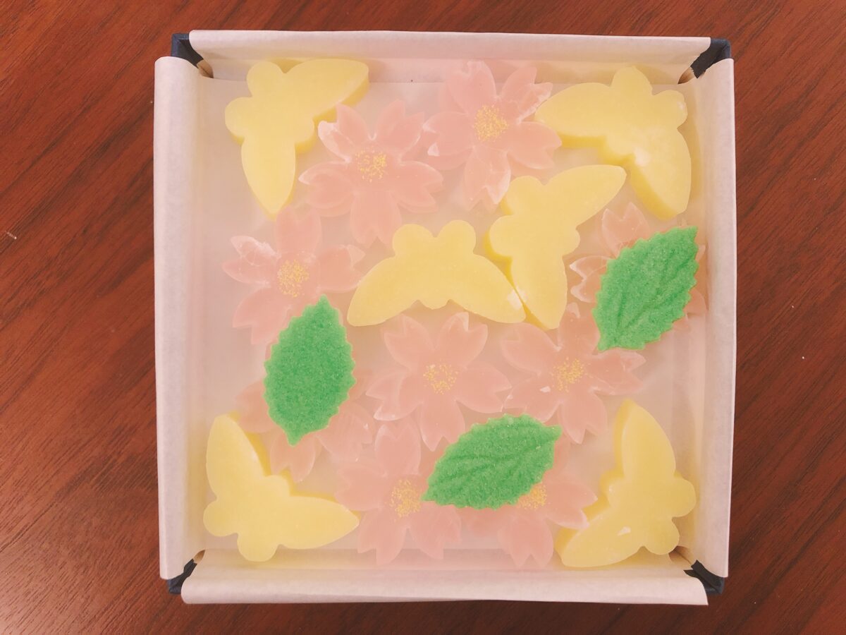 ふたを開けると、まるで宝石箱!透き通るような桜をはじめ、蝶や葉っぱのモチーフがお干菓子になっています。