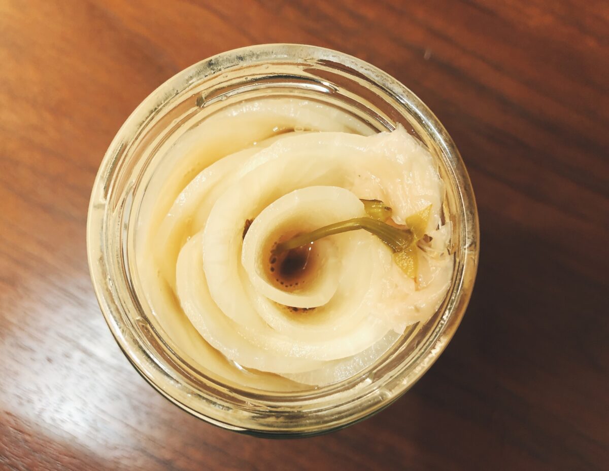 食べてみると、お酢とローリエのいい香りがして、かぶのやわらかな歯ざわりが印象的なピクルスでした。桜ははっきりと味を感じるというよりは、お酢の香りや後味に青みのある奥行きを出すような感じで活きていて、とても美味しいです。お酒のお供にはもちろん、お花見のときには、サンドイッチやハンバーガーと一緒に、ビンごと持参してお花見気分を演出してみてはいかがでしょうか。