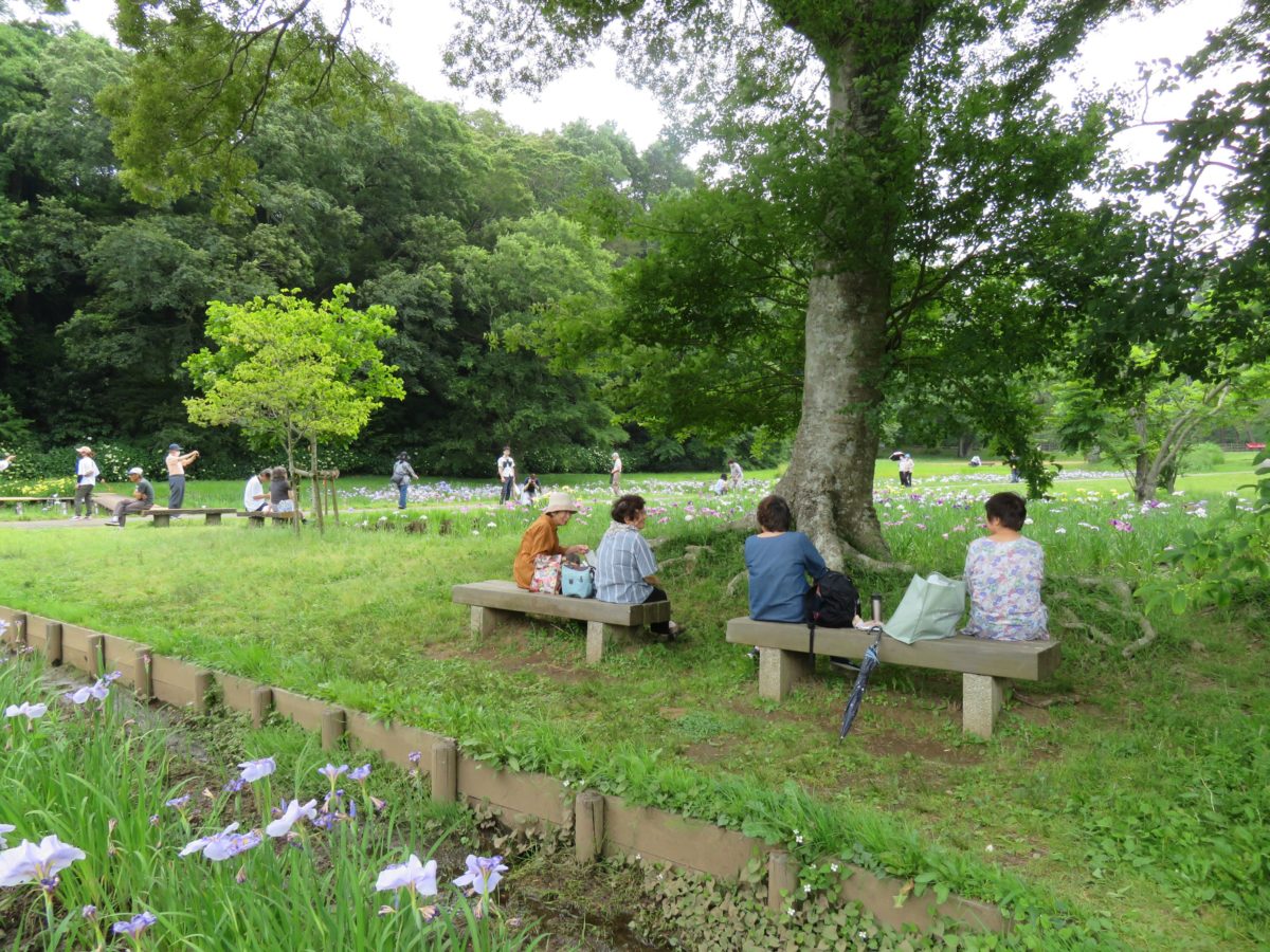 菖蒲田の中央には休憩用のベンチも設置されます。ベンチに腰掛けると360度のパノラマで花菖蒲を楽しむことができます。