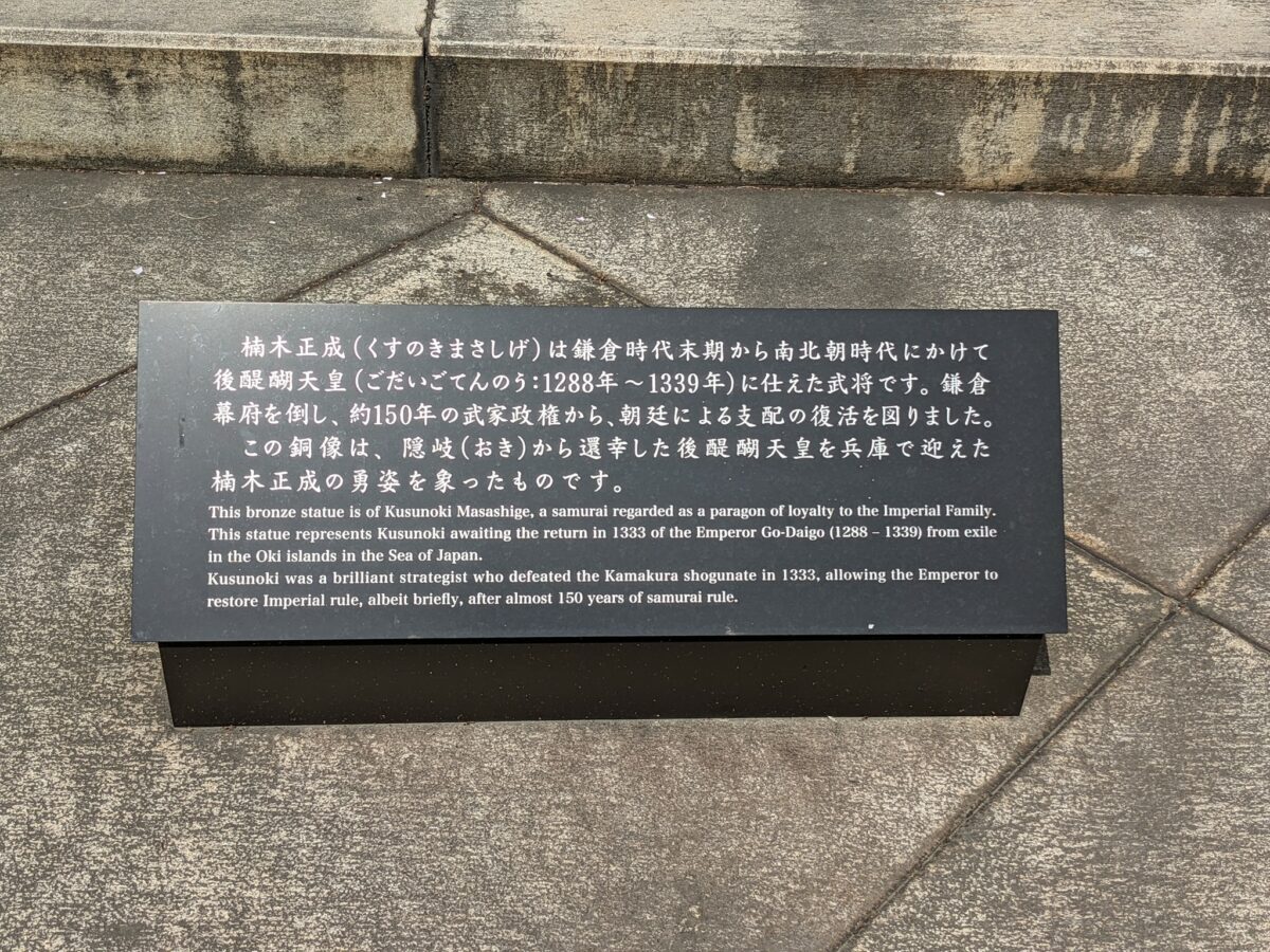 この楠木正成像は、別子銅山開坑200周年事業として住友から宮内庁に献納されたもので、製作は東京美術学校(現在の東京藝術大学の前身)が行いました。学校の木彫科を総動員し、約3年をかけて木彫の原型が完成、木型は鋳造に引き継がれ、我が国初めての分解鋳造法による銅像が、明治33年(1900年)に竣工したのであります。本体の高さは約4m、台座を含めると8mに及ぶ堂々たる姿で、上野公園の西郷隆盛像、靖国神社の大村益次郎像と並び「東京の三大銅像」の一つに数えられています。