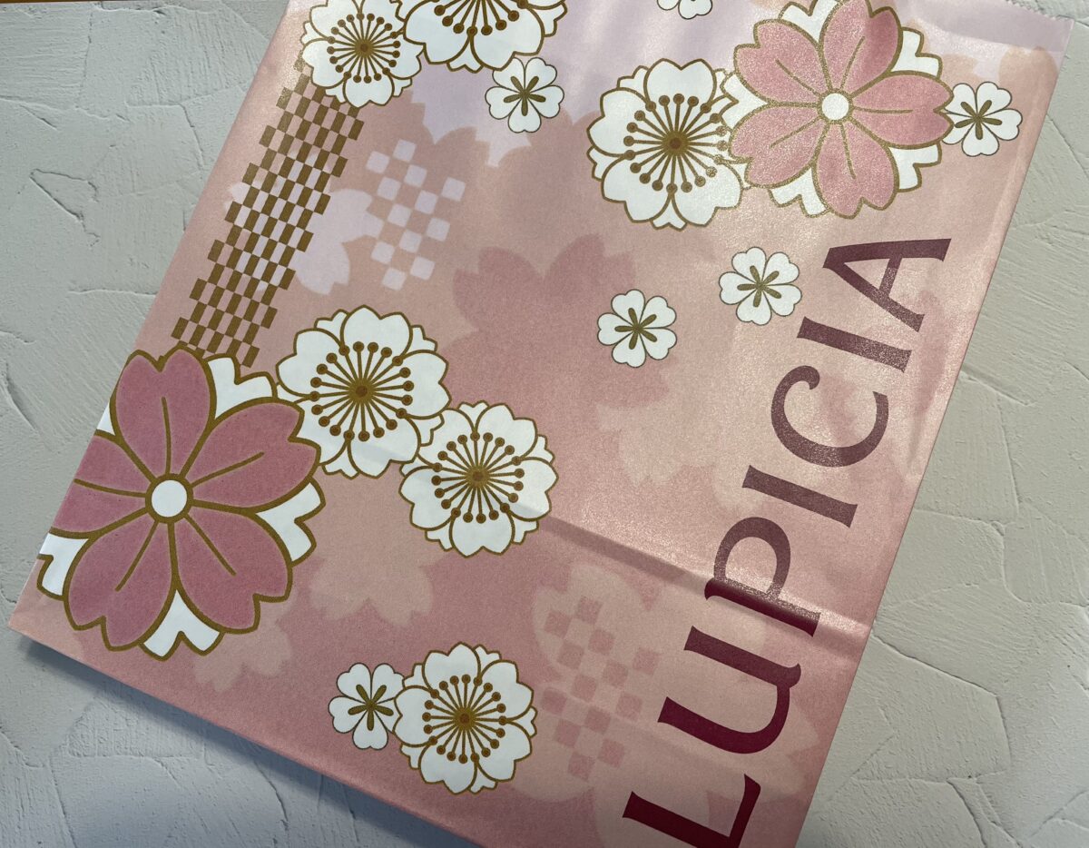 春限定の手提げ袋は桜柄のとても可愛らしい紙袋で各20円別途かかります。サイズは大・小がありました。市松模様や麻の葉模様など、日本の伝統的な柄も、ちりばめられています。