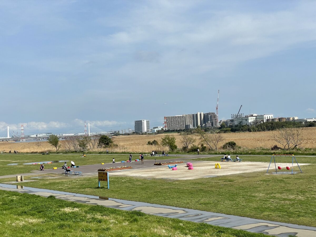 河川敷の途中には、大きな芝生の広場や、お子さまが遊べる遊具のある公園もあり、子どもたちが楽しそうに遊んでいる姿も見ることができました。自転車の練習をしたり、縄跳びをしたりとお子さまの楽しそうな声が聞こえます。
