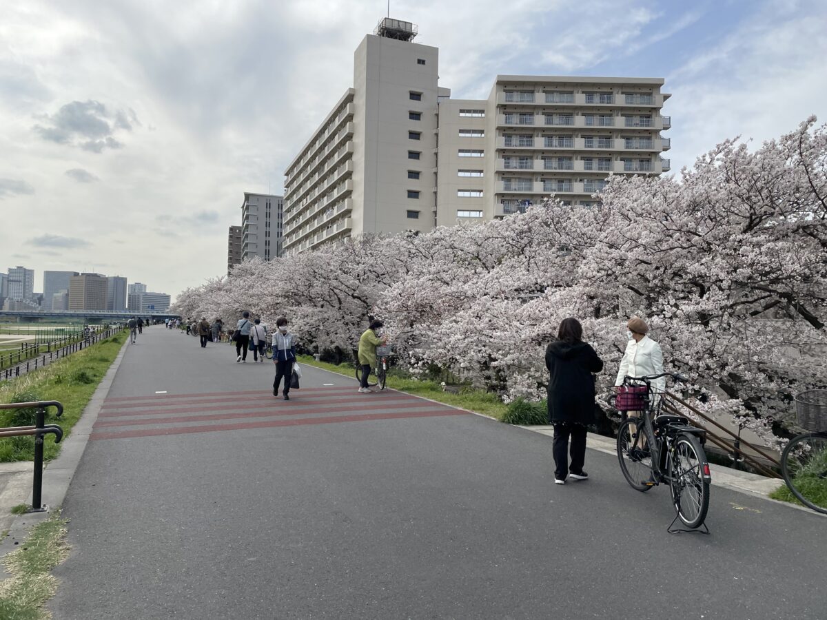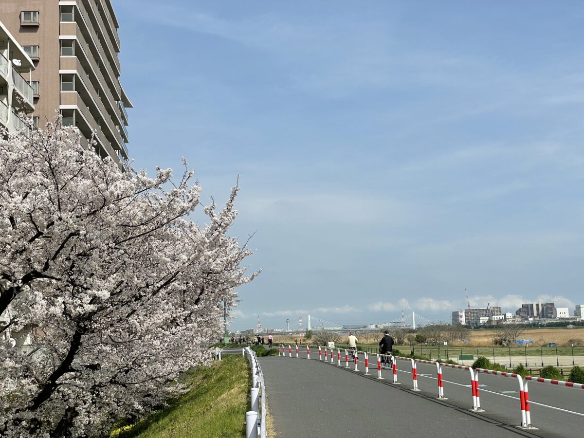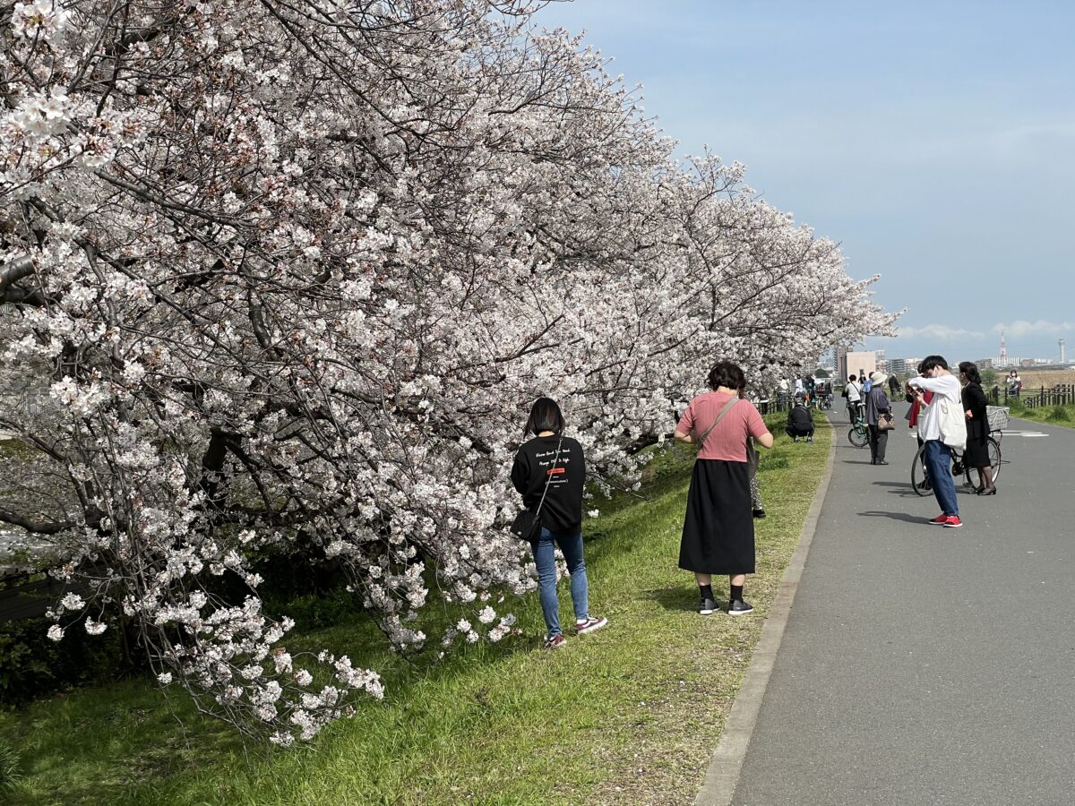 六郷橋から六郷水門までの河川敷に広がる玉川六郷橋緑地公園。整備された遊歩道では、散策をしている方やランニングをしている人、サイクリングをしている人を多く見かけます。この時期は土手沿いの桜が満開となり、多くの方が、散策をしながらお花見を楽しんでいました。