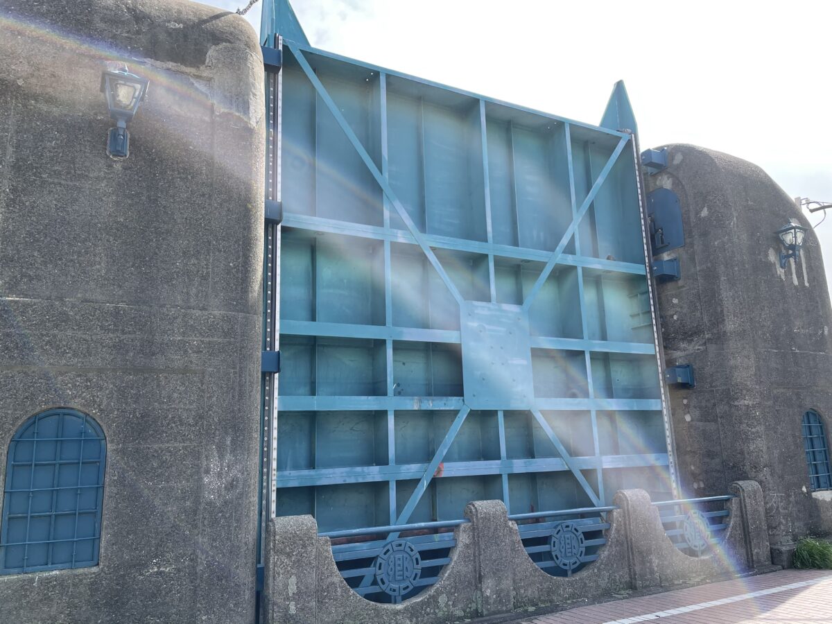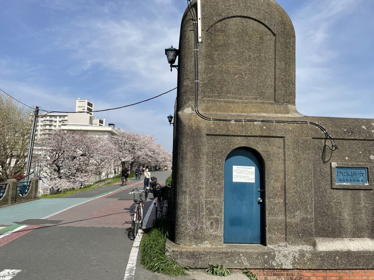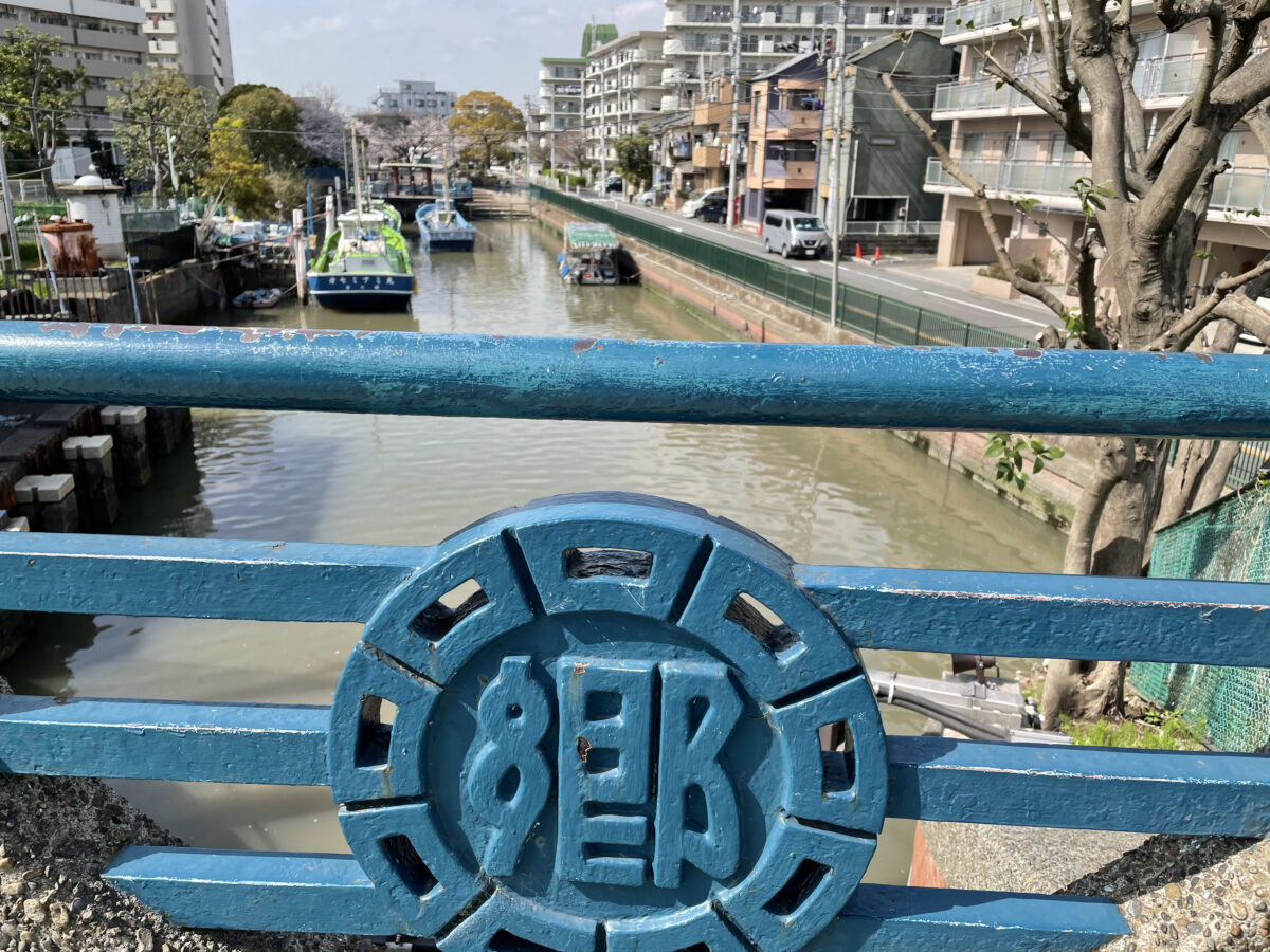 水門に架かる橋の高欄の「郷」の字を「口」の字で囲むデザインは、地元の旧六郷町の町章から用いたものだそうです。堤内地の舟だまりは、かつて舟運にも利用されていて、雑色運河と呼ばれたころの雰囲気が残っていました。