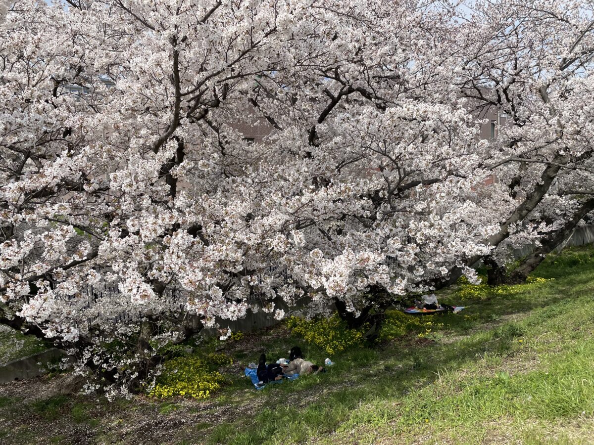 土手の斜面でレジャーシートを引いて、お花見している方も。大人数での宴会のようなお花見客はおらず、みなさん静かに少人数で、短時間でお花見をされていて、しっかりと感染予防対策もされていました。
