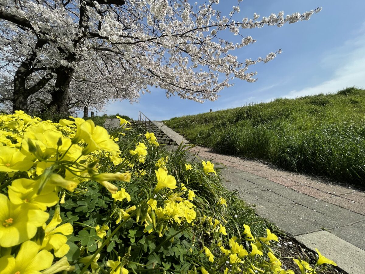 黄色いカタバミの花も咲いていて、黄色とピンクの桜、土手の緑、青い空の自然の色合いがとてもきれいな場所もあり、ついカメラのシャッターをたくさん押してしまいます。