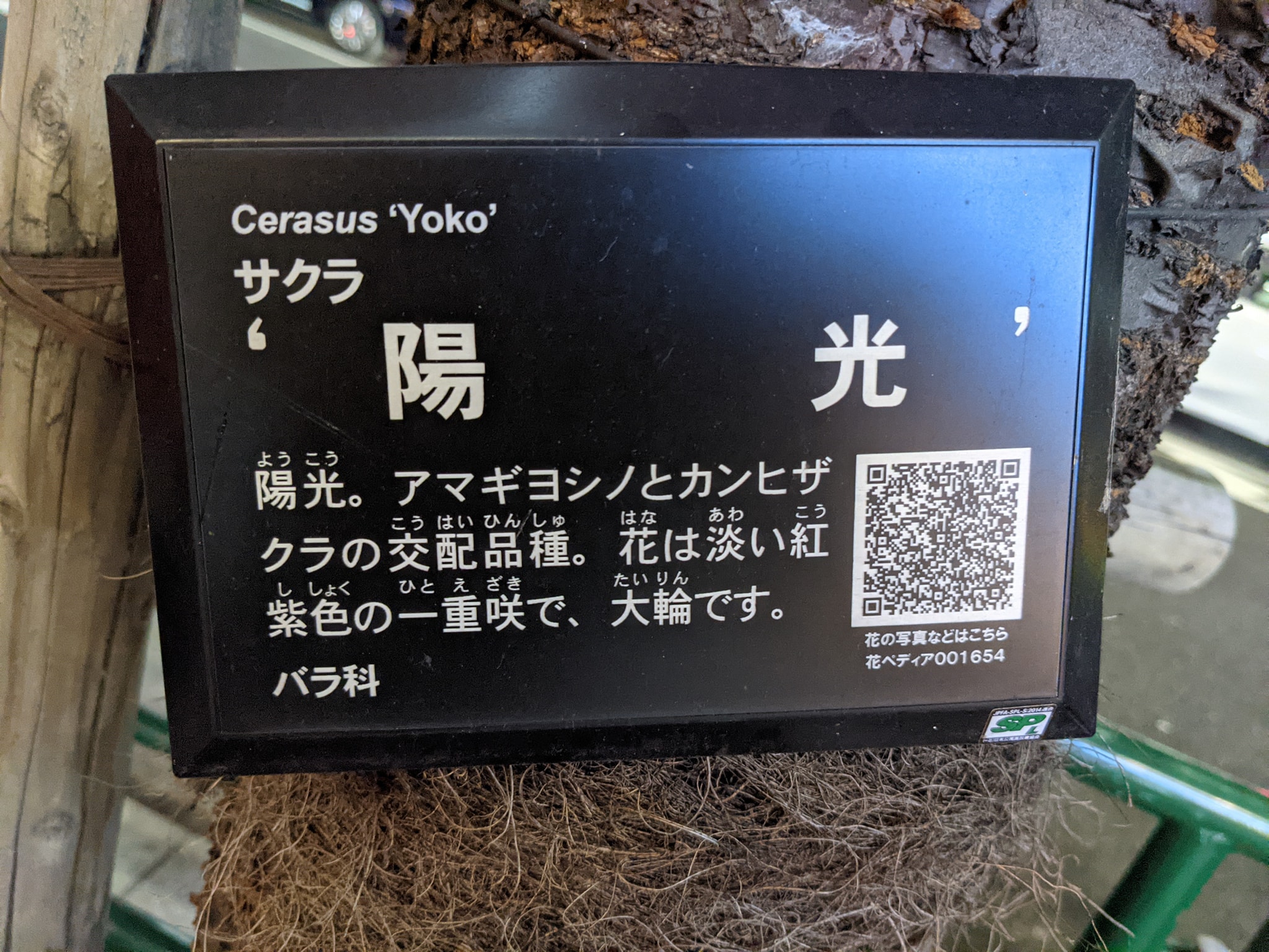 3月12日には渋谷警察前の明治通りに桜が咲いていました。こちらの桜はかなり早い時期に咲いており驚きました。陽光と言う品種のようで、アマギヨシノとカンヒザクラの交配品種だそうです。淡い紅紫色、一重咲で大輪が特徴です。桜の木の下に品種の簡単な説明とQRコードが付いていて、こちらを読み込むと、より詳しい桜の解説を楽しむことが出来るようになっていました。さすが、エンターテイメントシティSHIBUYAであります。