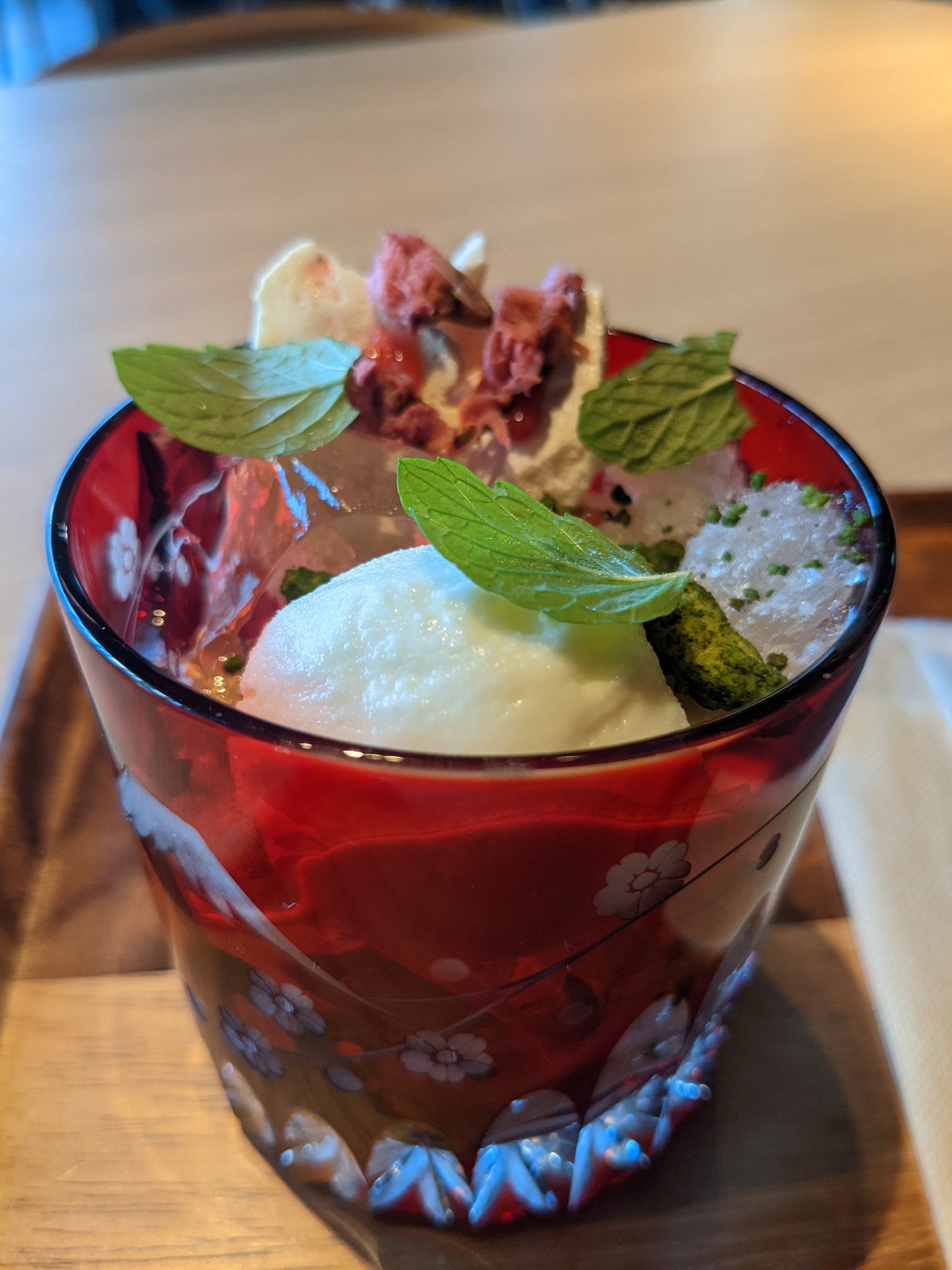 桜まつり期間限定の「甘酒と桜の和パフェ」(税込770円)を食しました。酔鯨酒造の甘酒と切子グラスが使用されております。甘さと桜の味が共存し、和風のテイストを楽しむことが出来ました。