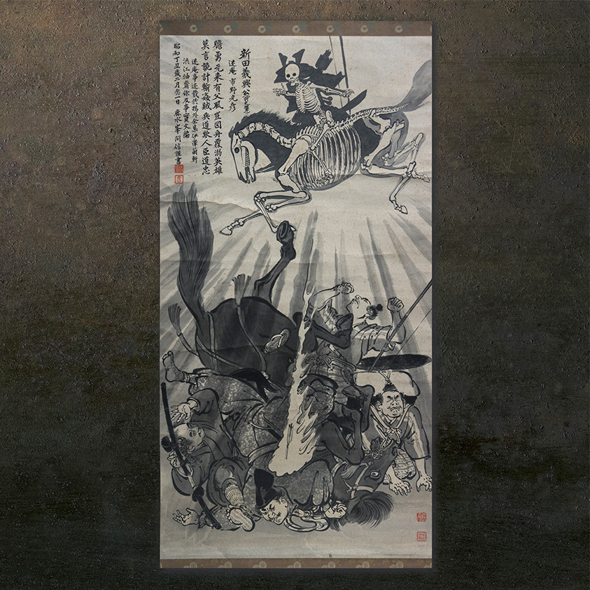 新田神社のHPが参考になりますが、このような御霊信仰は奈良時代末期から公家社会のみならず、広く民間にも浸透しています。政治上の争いや陰謀によって失脚憤死した皇族や公家の死霊の祟りが疫病・旱魃・虫害・飢饉・火災・戦乱などの天災地変や個人の病気・墳死などの事件を巡って、これらの原因であるかのように広く世に宣伝され、朝廷でもそれに対して復位・贈号・陳謝・慰霊などをもって、これらを鎮めようとしたことで大きくなって行きました。現代では御霊信仰は漫画やアニメで、その片鱗を楽しむことが出来ます。ダークファンタジー漫画の金字塔を打ち立てた三浦建太郎『ベルセルク』/ 白泉社に出てくるようなキャラクターは、正にその例と言え「新田公神霊図」にあるような髑髏のキャラクターも居ます。