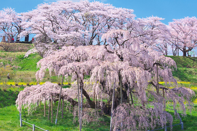■三春滝桜(福島県田村郡)は樹齢1000年超、滝のように枝を大きく垂らした鮮やかなベニシダレザクラ