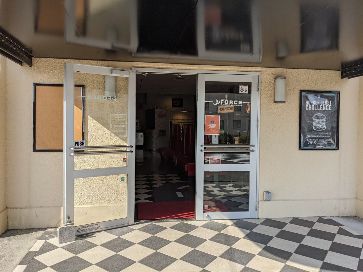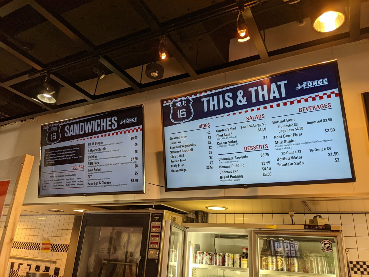 基地内に「ルート16(シックスティーン)」という飲食店がありました。最初、ルート66(シックスティー)というアメリカで有名なかつての国道のことかと聞き間違えましたが違いました笑 横田基地に面した国道が「国道16号」のようで、こちらに掛けたのでしょうか。 お店のつくりからアメリカっぽい雰囲気がひしひしと伝わって来ます。