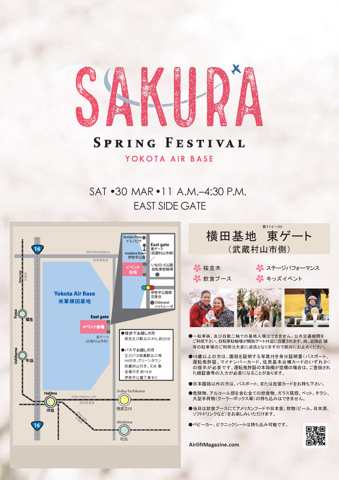 こちらが例年であれば、桜スプリングフェスティバルが開催される場所だそうです。ライターが行った時は、桜は満開ではありませんでしたが、木々に花がつきはじめ、近くに行くと綺麗に見ることが出来ました。新型コロナ禍でなければ、以下のパンフレットのような内容で開催されているようです。基地の武蔵村山市側で開催されるので、バスか車が良さそうです。ライターは福生方面のゲートから入ったので、この場所までは基地の車で案内してもらいましたが、福生側からだとかなりの距離がありました。