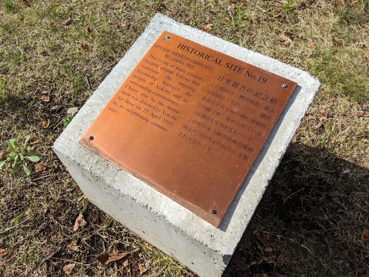 基地内の中で古くから残る桜の1つは、基地の反対側にあります。横田基地と日本の地域の方々との友情を示しています。1953年4月23日に、基地の中心地であった場所に1本の桜が植えられました。基地と日本の地域社会の友情がいかに親密であるかを示しており、私たちはそれがこれからも続いていくことを願っています。