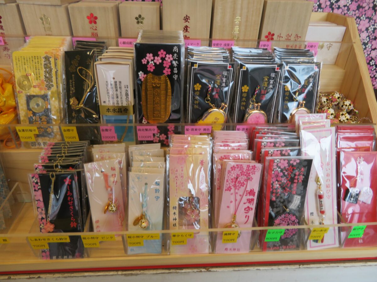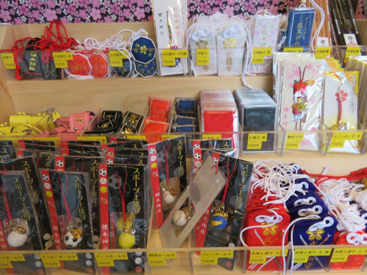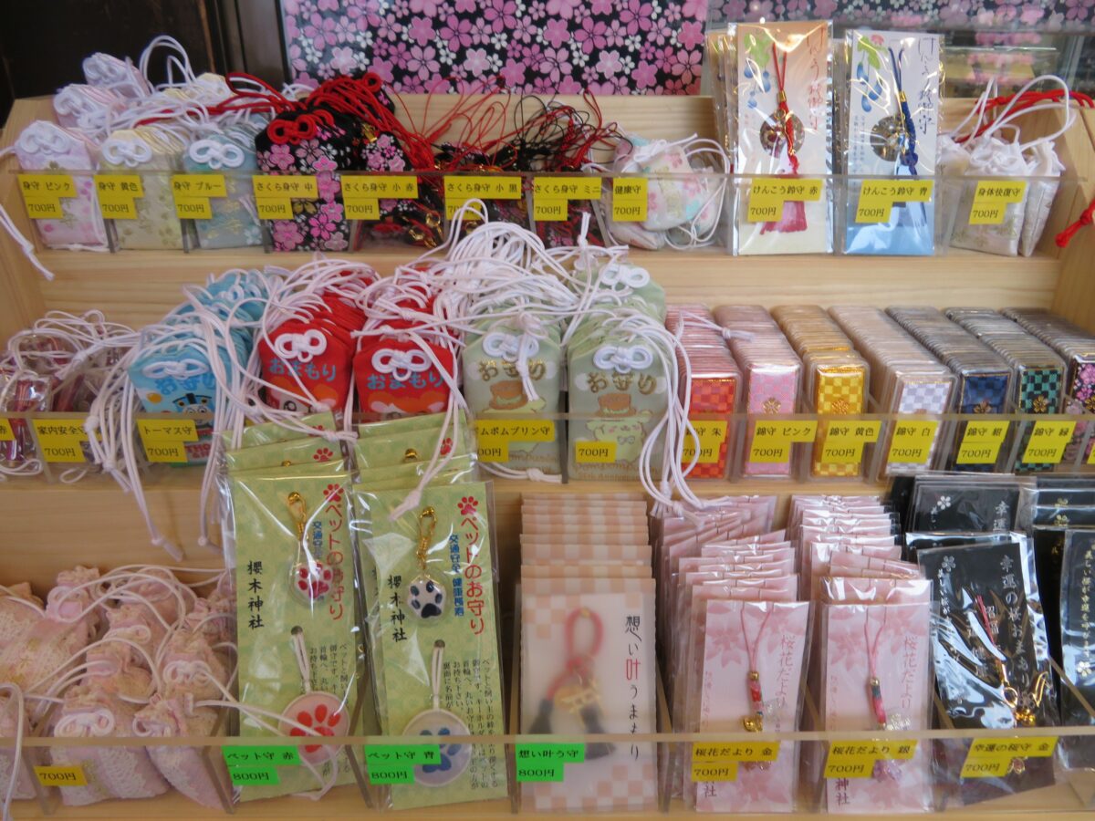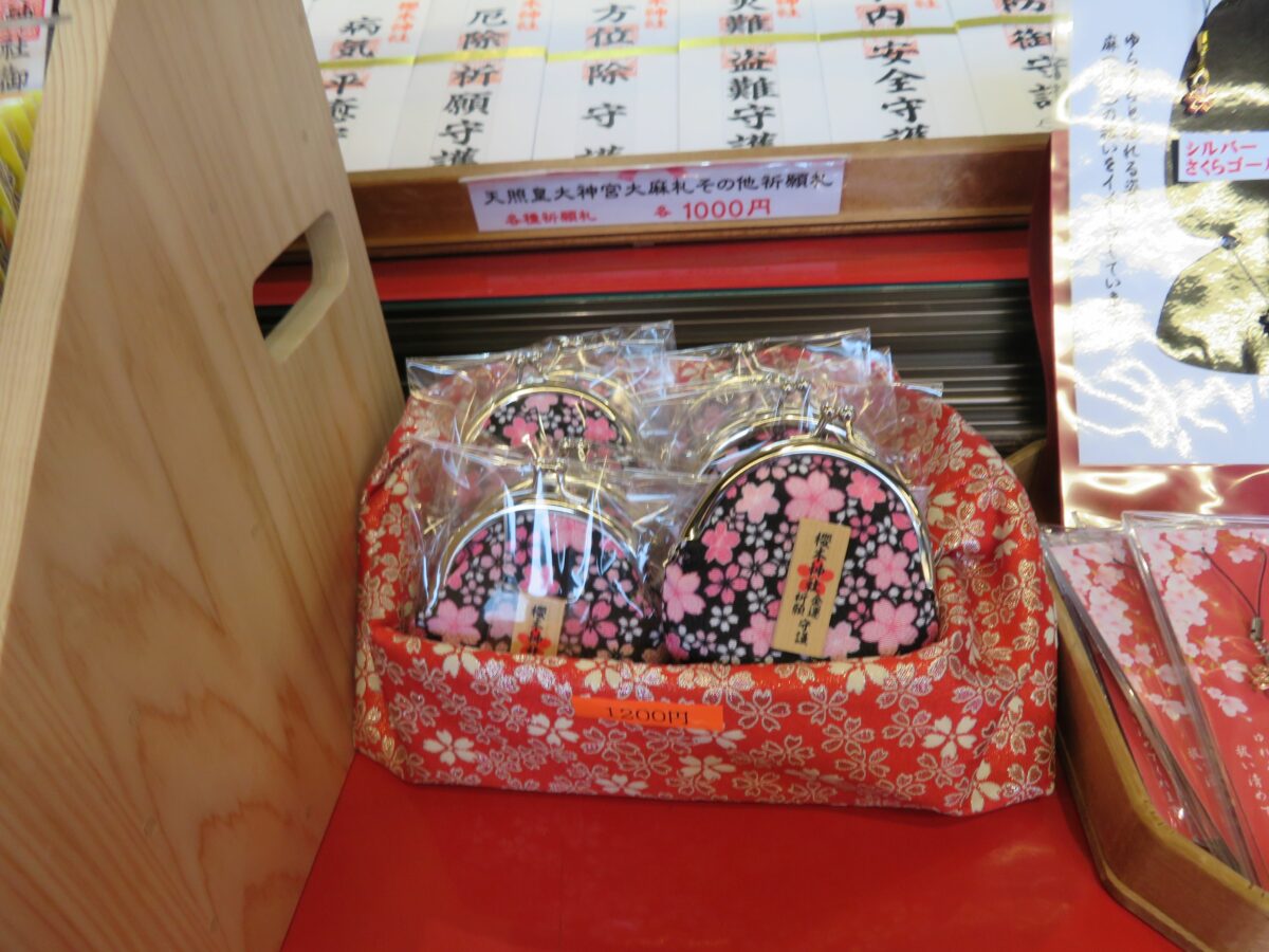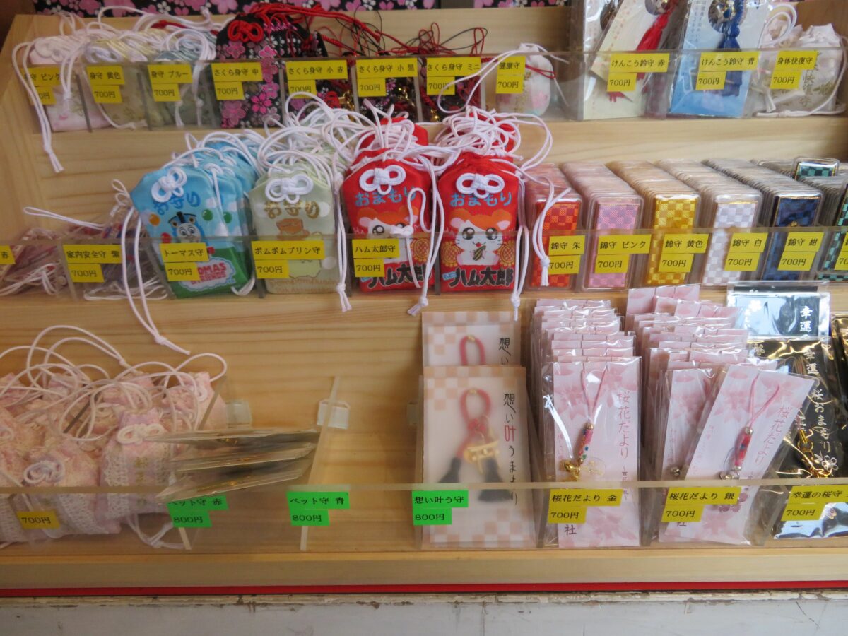 御朱印受付に並ぶ授与品の窓口には、お守りや、絵馬、熊手、破魔矢、小銭入れ、トートバック、桜あめなど、多種多様の授与品が並びます。