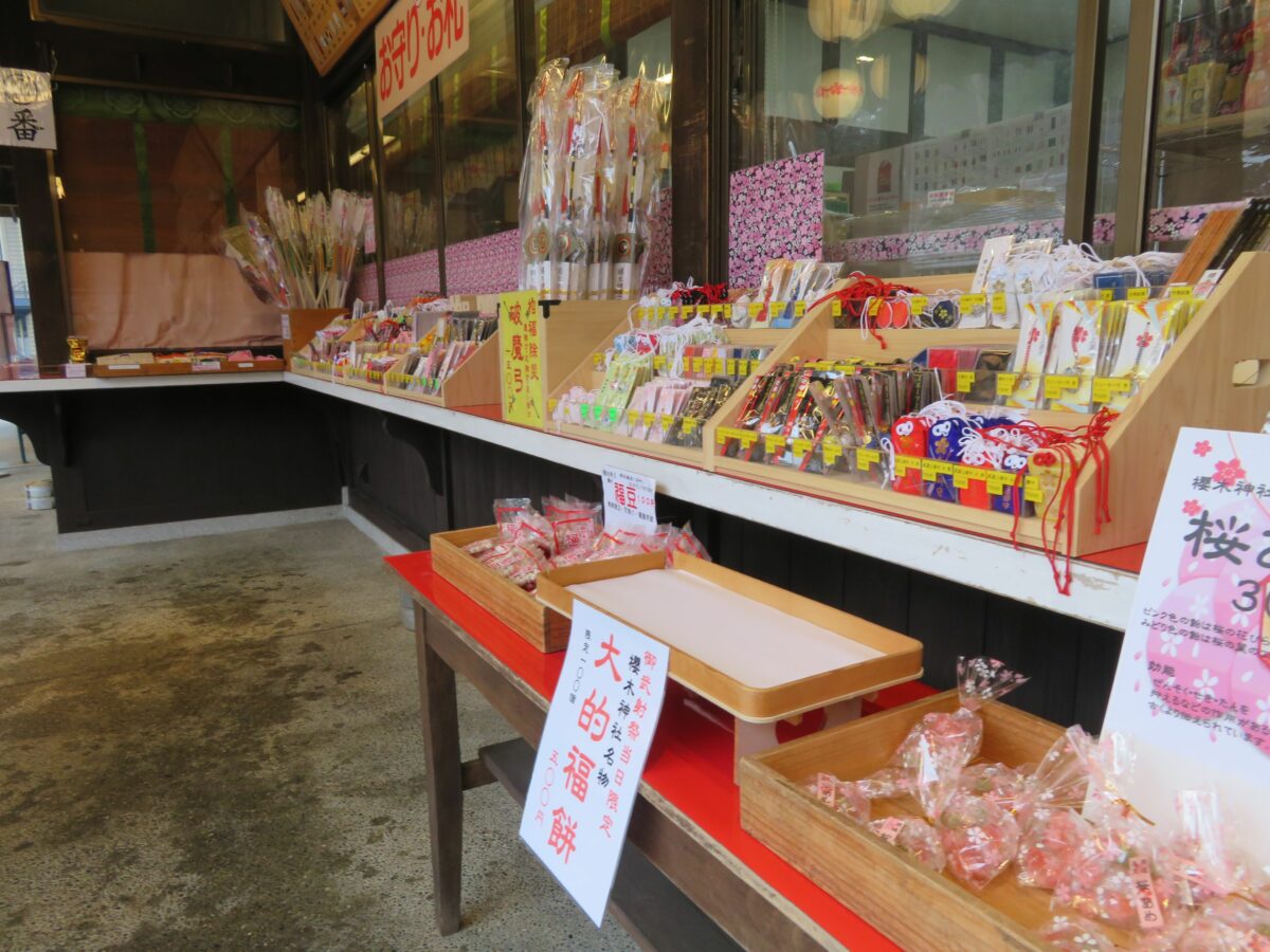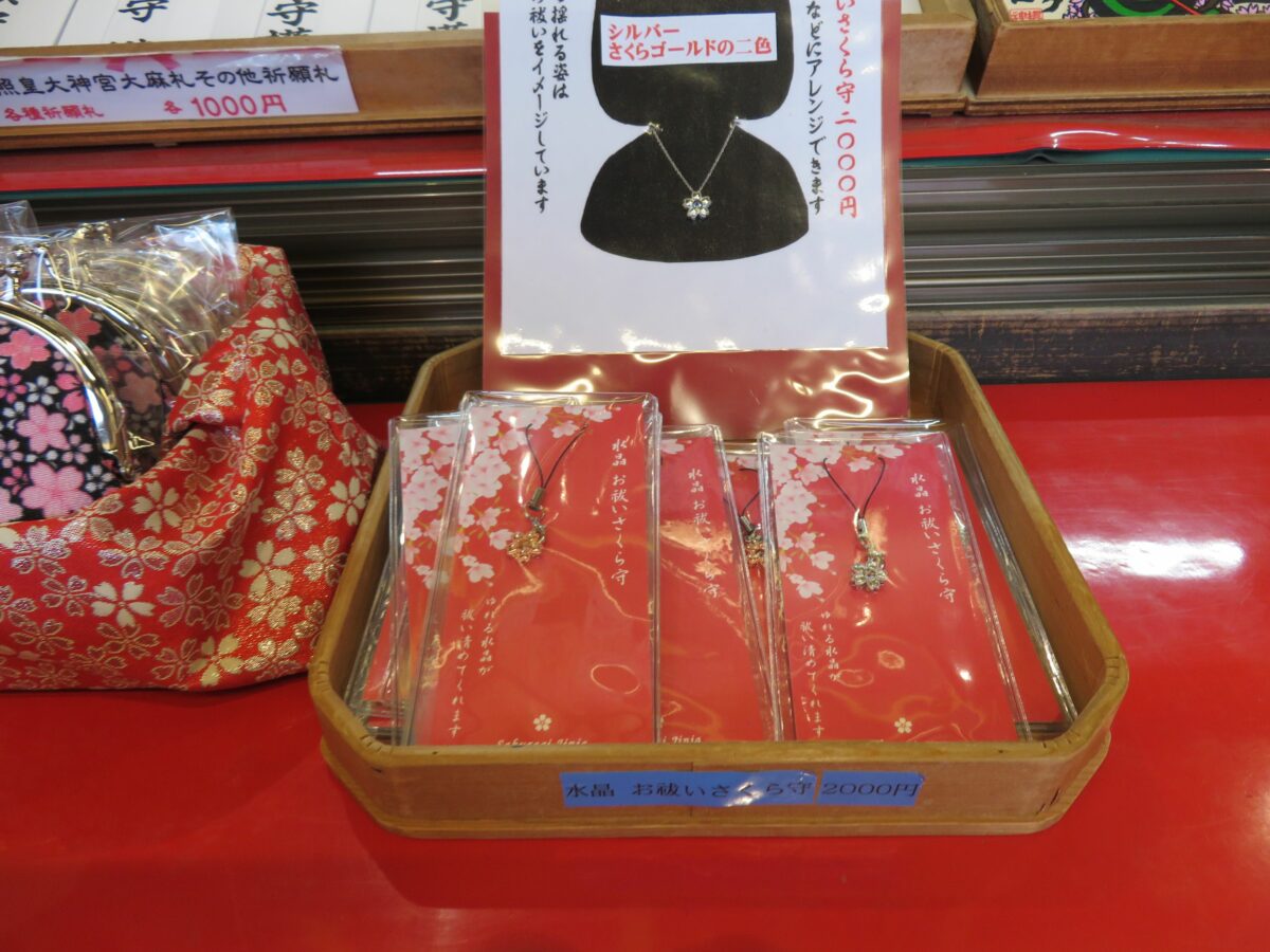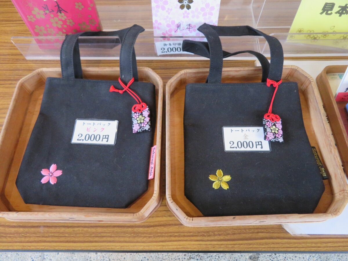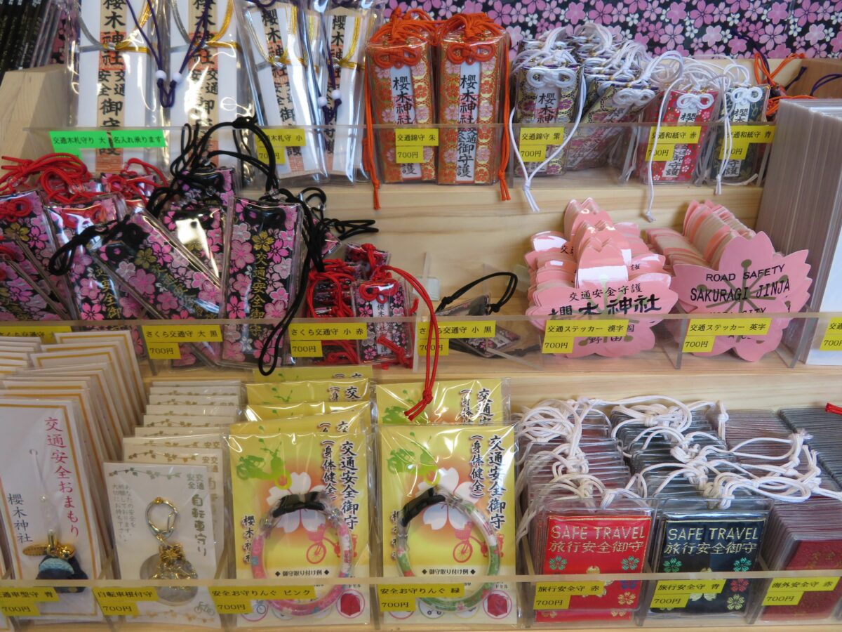 御朱印受付に並ぶ授与品の窓口には、お守りや、絵馬、熊手、破魔矢、小銭入れ、トートバック、桜あめなど、多種多様の授与品が並びます。