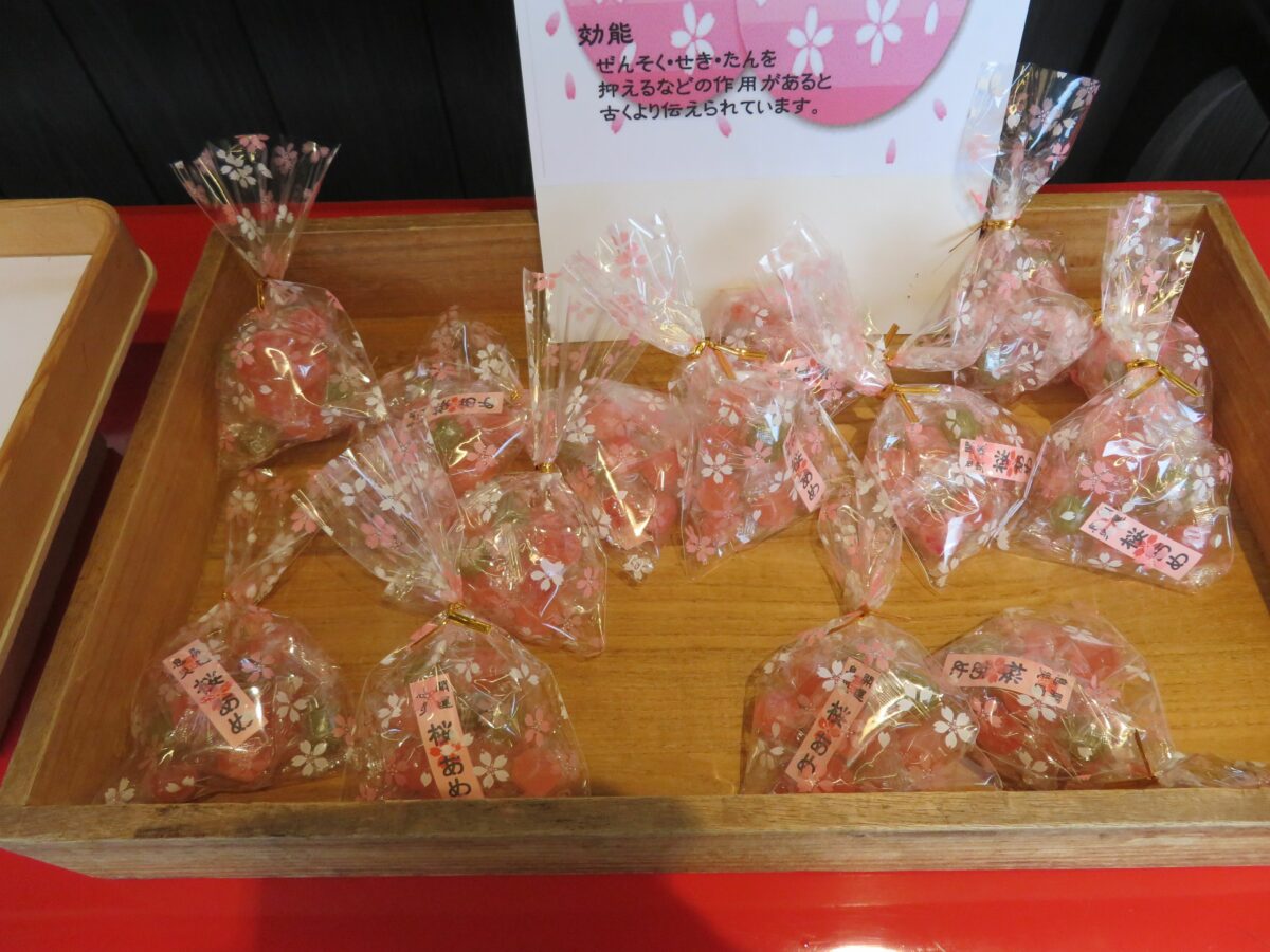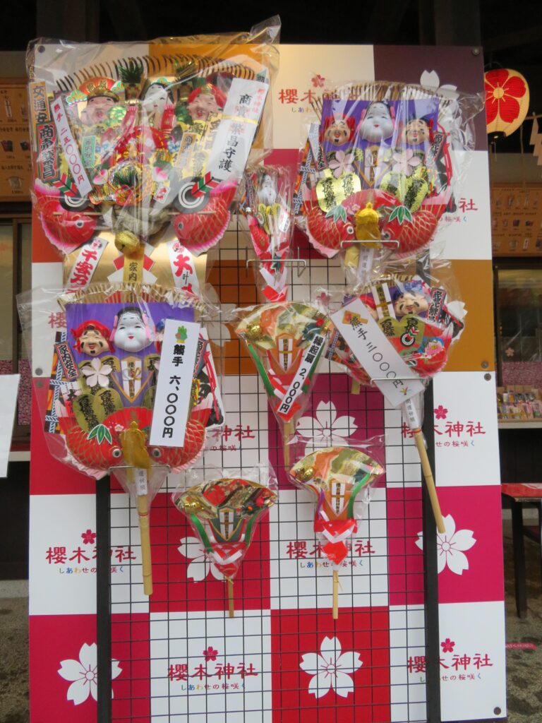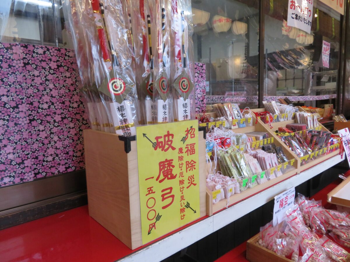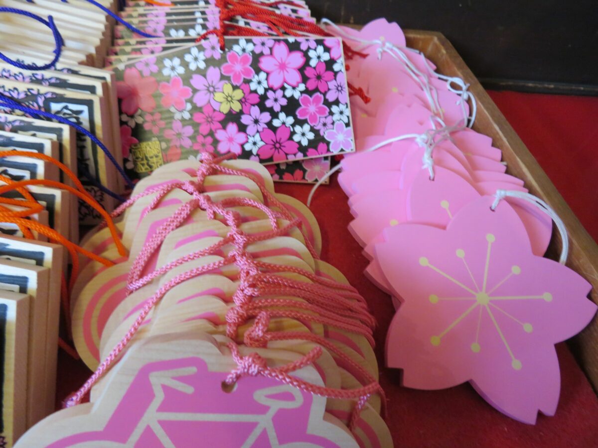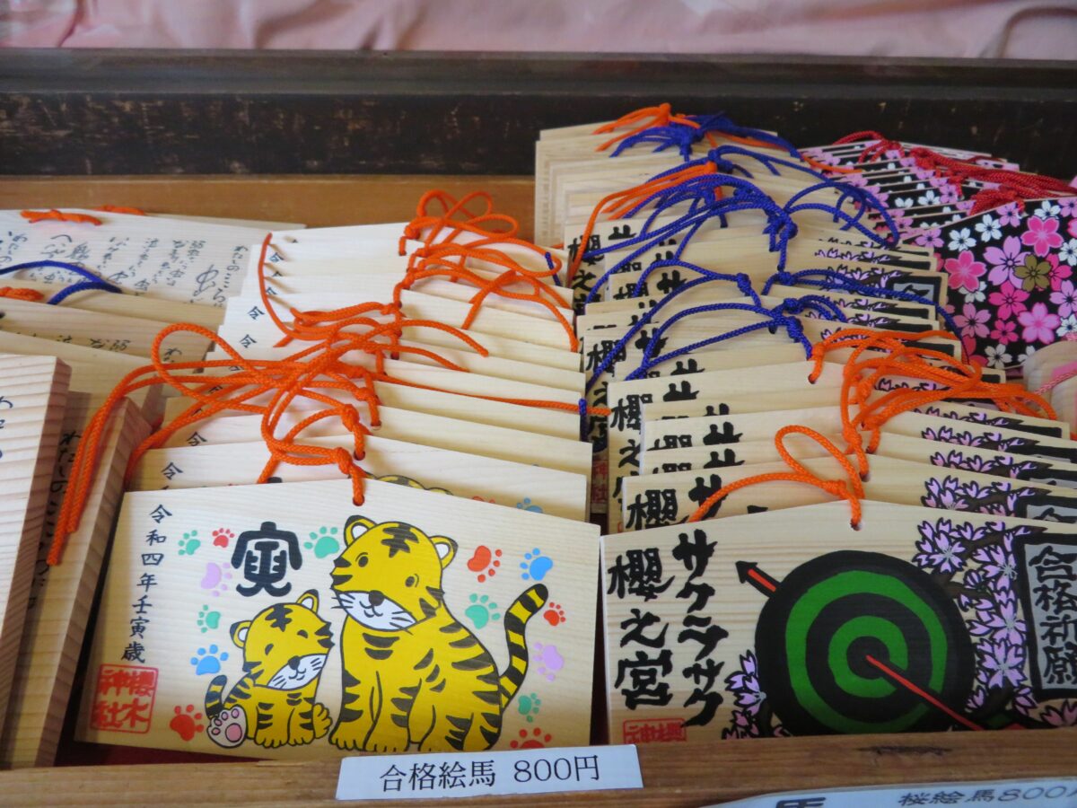 御朱印受付に並ぶ授与品の窓口には、お守りや、絵馬、熊手、破魔矢、小銭入れ、トートバック、桜あめなど、多種多様の授与品が並びます。