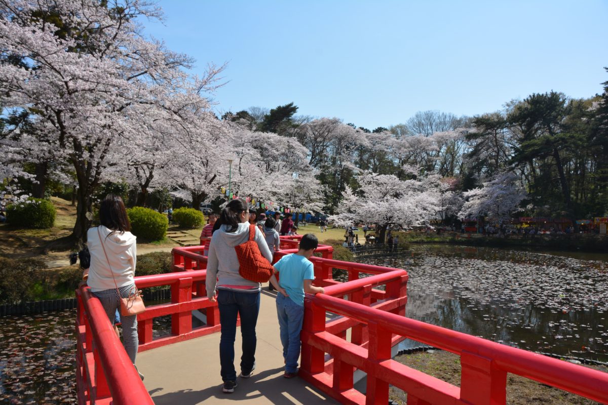 さいたま市の岩槻区は、1457年に太田道灌によって築かれたと伝わる岩槻城の城下町として発展しました。岩槻城の新曲輪、鍛冶曲輪と呼ばれた出丸跡が、岩槻城址公園として整備されています。園内には約600本の桜が植樹されています。桜が開花すると、公園中央の菖蒲池に架かる朱塗りの八ツ橋が、華やいだ雰囲気で包まれます。