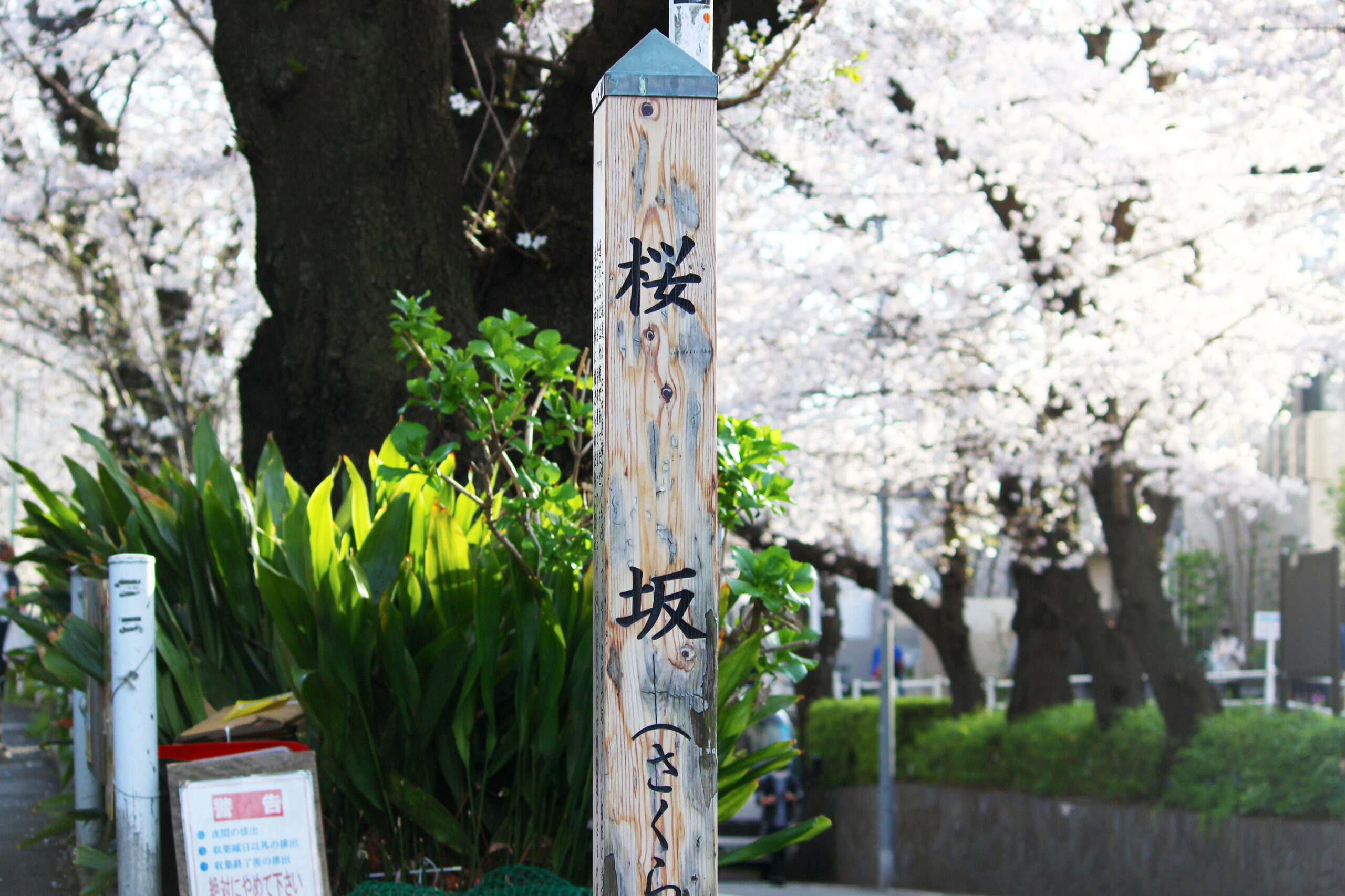 田園調布の住宅街の中に、突如現れる満開の桜。信号の標識にも、さくら坂の文字が記載されています。