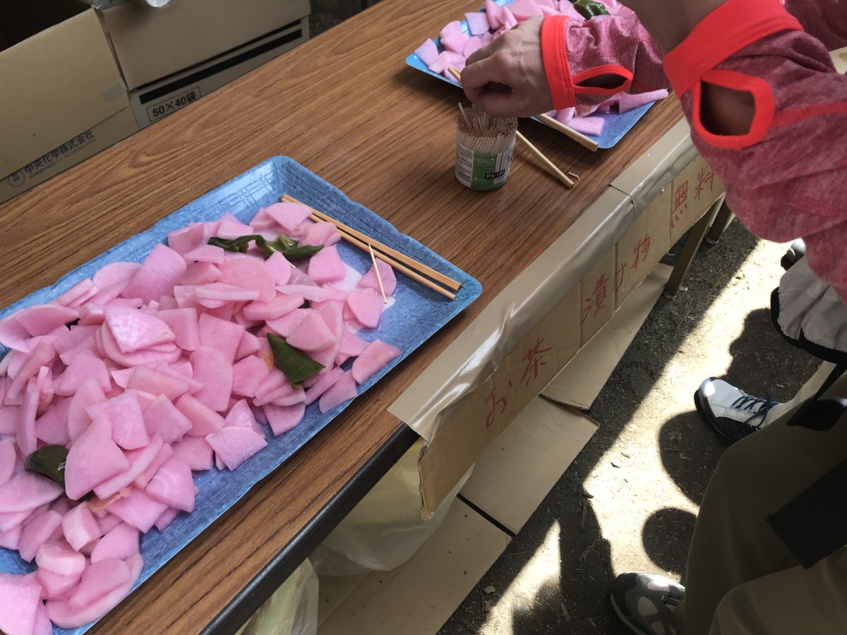 もちろんこれらは有料ですが、無料でのふるまいもありますので要チェックです!こちらが無料でふるまわれていた「コショウ漬け」。小谷村にしかない漬物で「村から外に出すと味が変わる」と言われているとか。ピンク色は大根で、緑色は地元で「コショウ」と呼ばれる青唐辛子です。塩気が強く、後味がほんのり辛くて美味しい。つい手が出てしまいます。