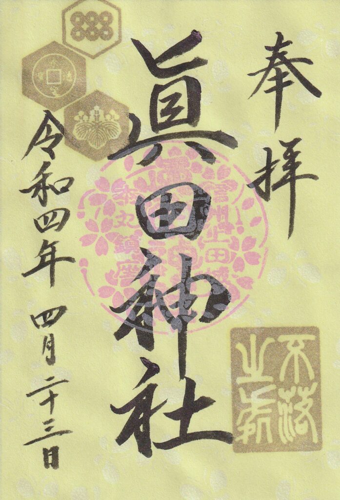 全国各地の神社や寺院では参詣の記念に御朱印を頂くことができます。御朱印帳に訪れた神社や寺院の御朱印が並ぶと、貴重な思い出となり写真とは趣の異なる味わいが滲み出てくるものでしょう。長野県上田市の上田城祉公園内本丸跡に鎮座する眞田神社では、戦国時代に信州で活躍した真田家に因むバラエティー豊富な御朱印が頒布されています。通常の御朱印の右上には真田家の家紋、六文銭の印が押され中央には月変わりで智、仁、勇の文字が記されます。