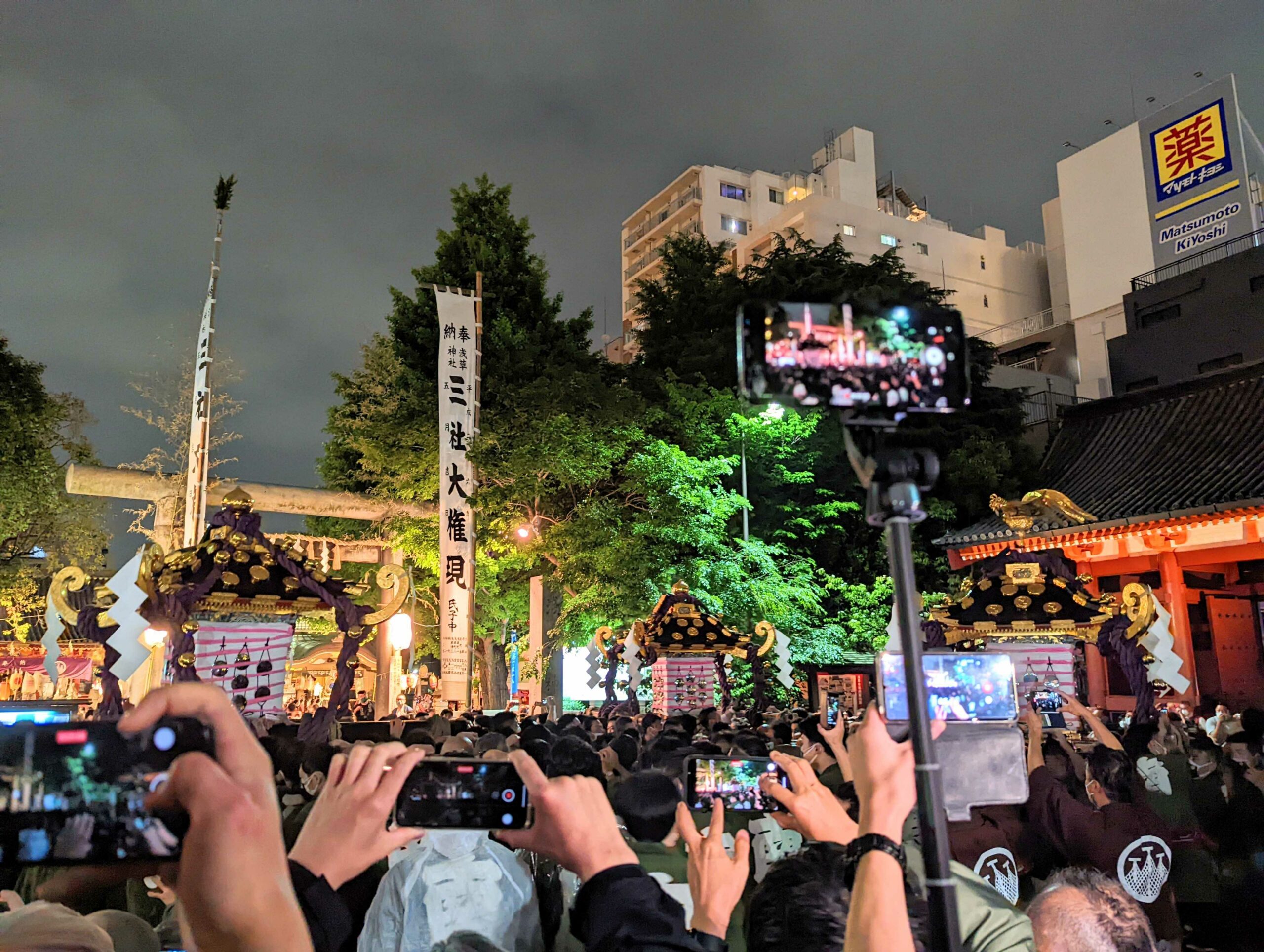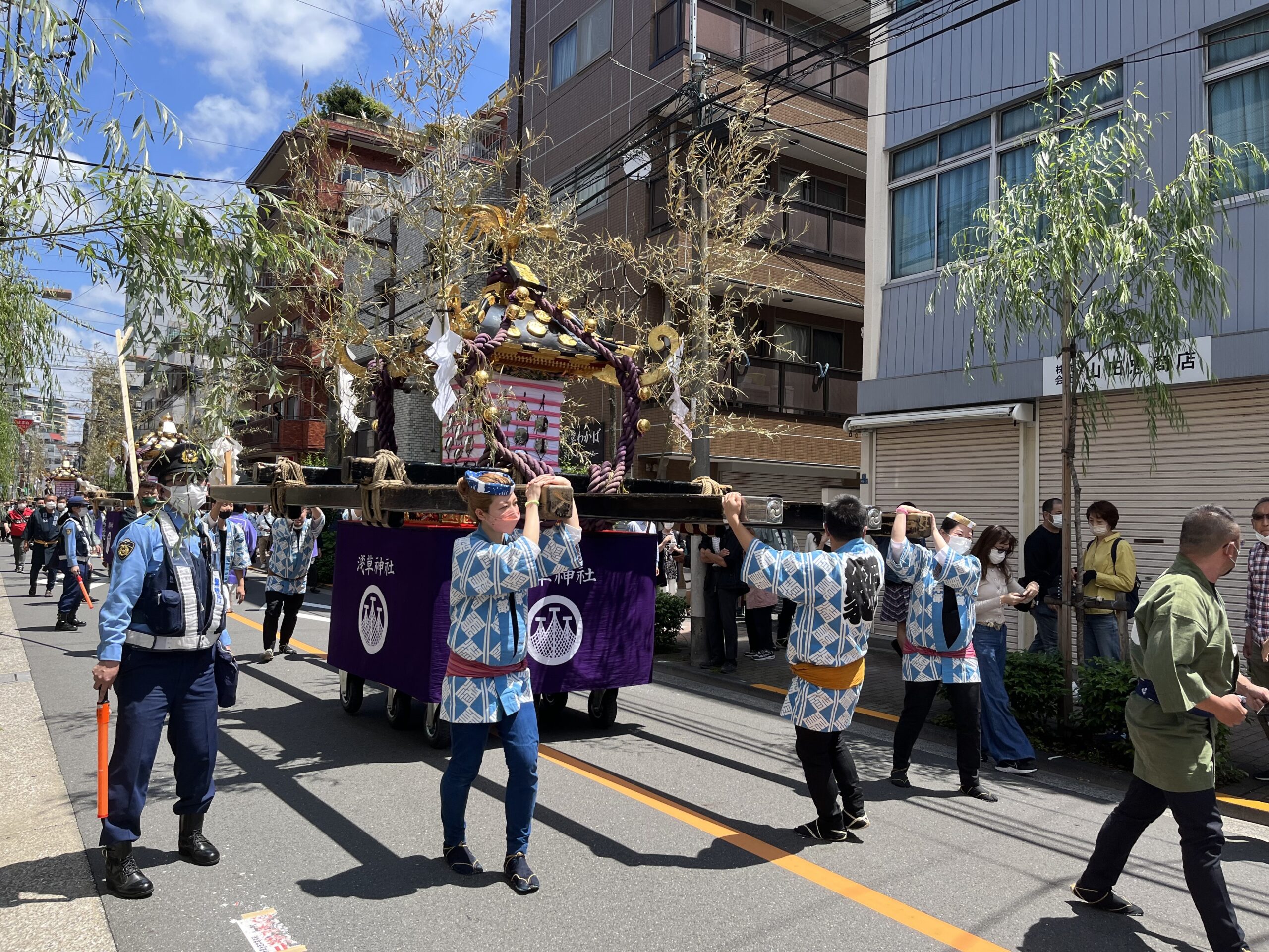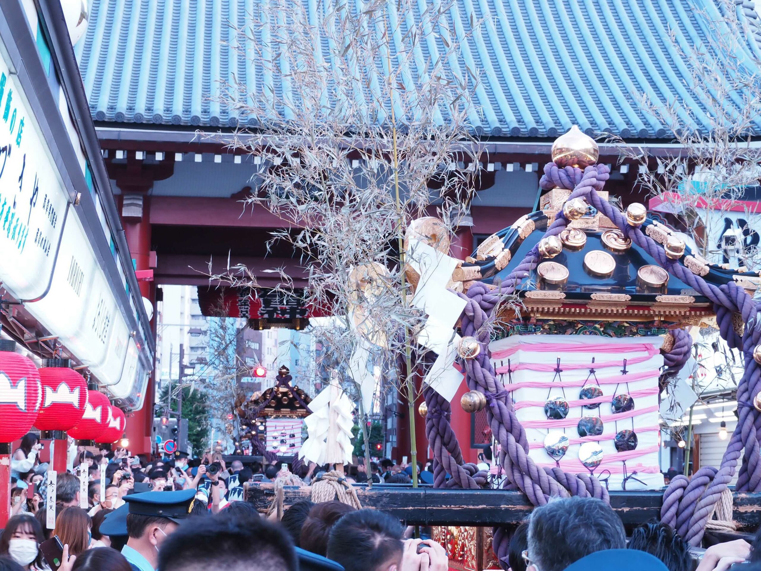 例年は浅草寺を中心とする氏子地域を3方向に別れ、3基のお神輿が各地区を年毎に交代で巡行を行っていたが、新型コロナウイルス感染症拡大の影響により、2020年は神輿をトラックの荷台に載せて巡行。2021年は、神輿の巡行自体を中止していた。今年は、3基の本社神輿を「 曳台(ひきだい )」に載せて、連なる異例の形で浅草44町会を練り歩いた。