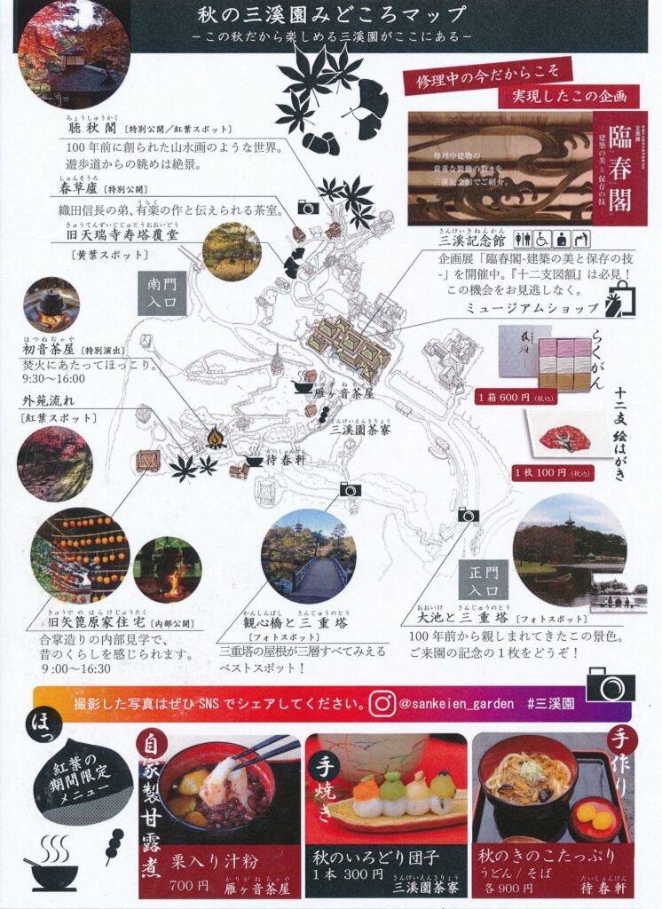三溪園は大池を中心として点在する古建築が季節の彩りに包まれます。