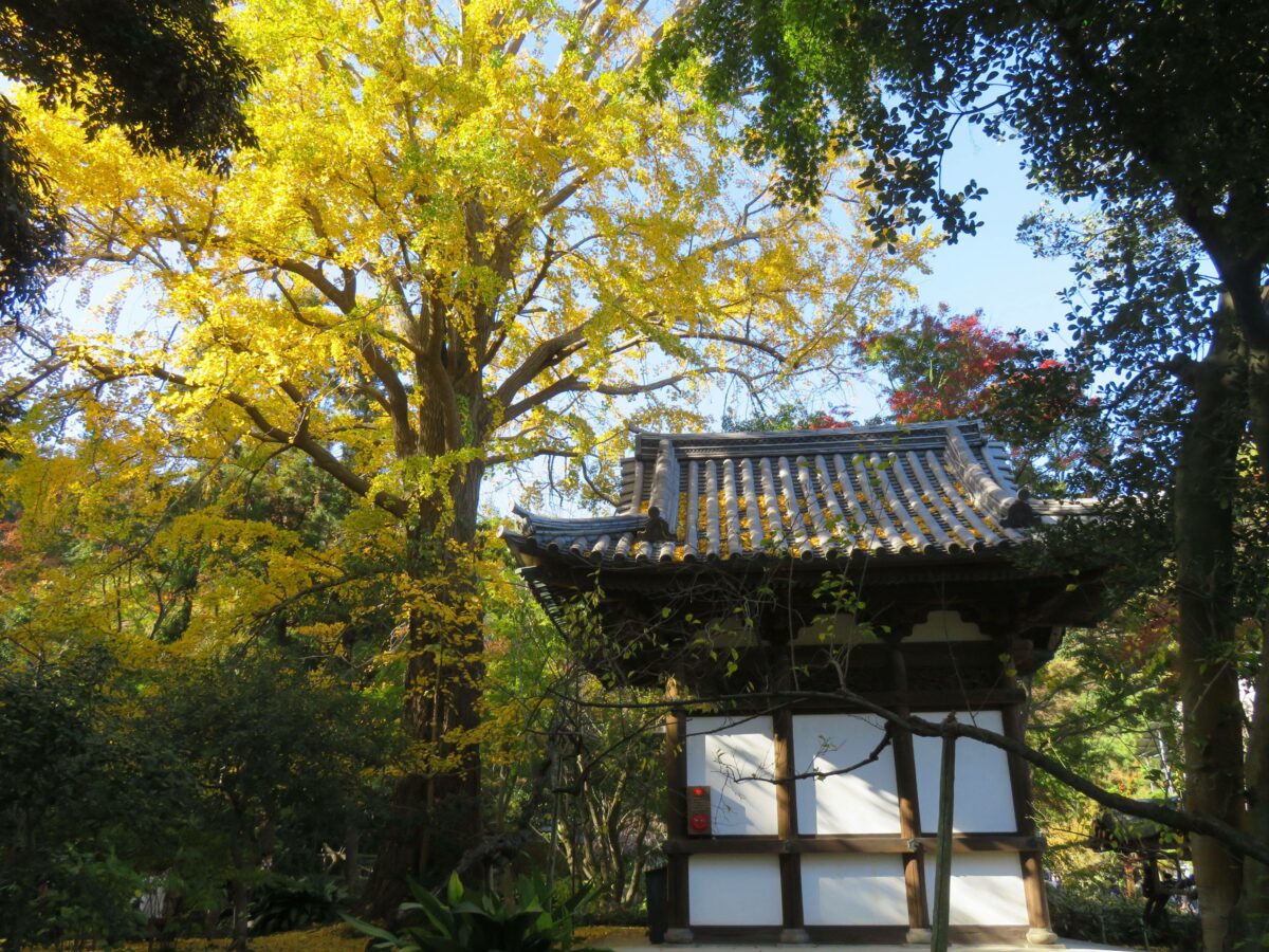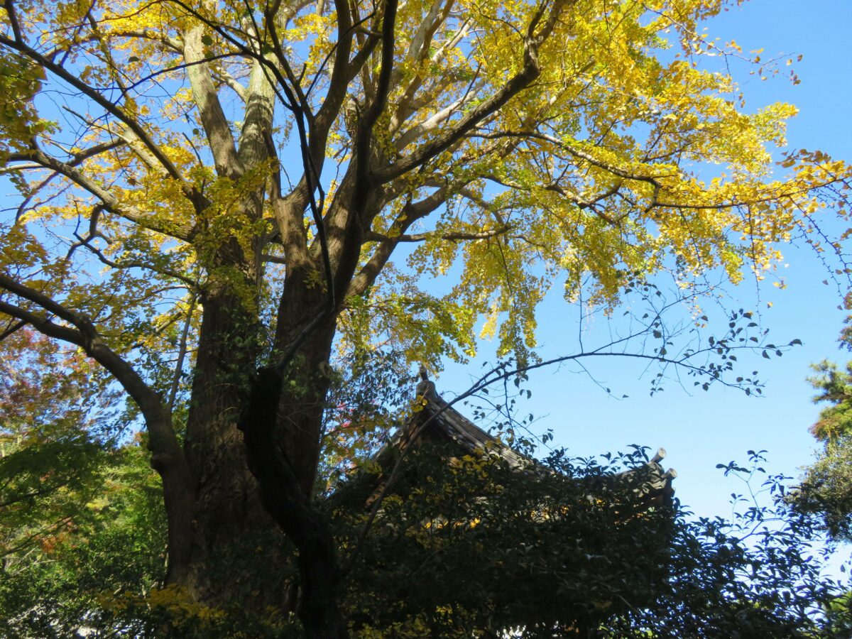 三溪記念館から園路を南西に向かうと、原三溪が最初に三渓園苑に移築した古建築の旧天瑞寺寿塔覆堂が建っています。堂の南に寄り添うように大きなイチョウが育っています。太い幹の下はイチョウの落葉で黄色の絨毯が敷かれたかのようです。