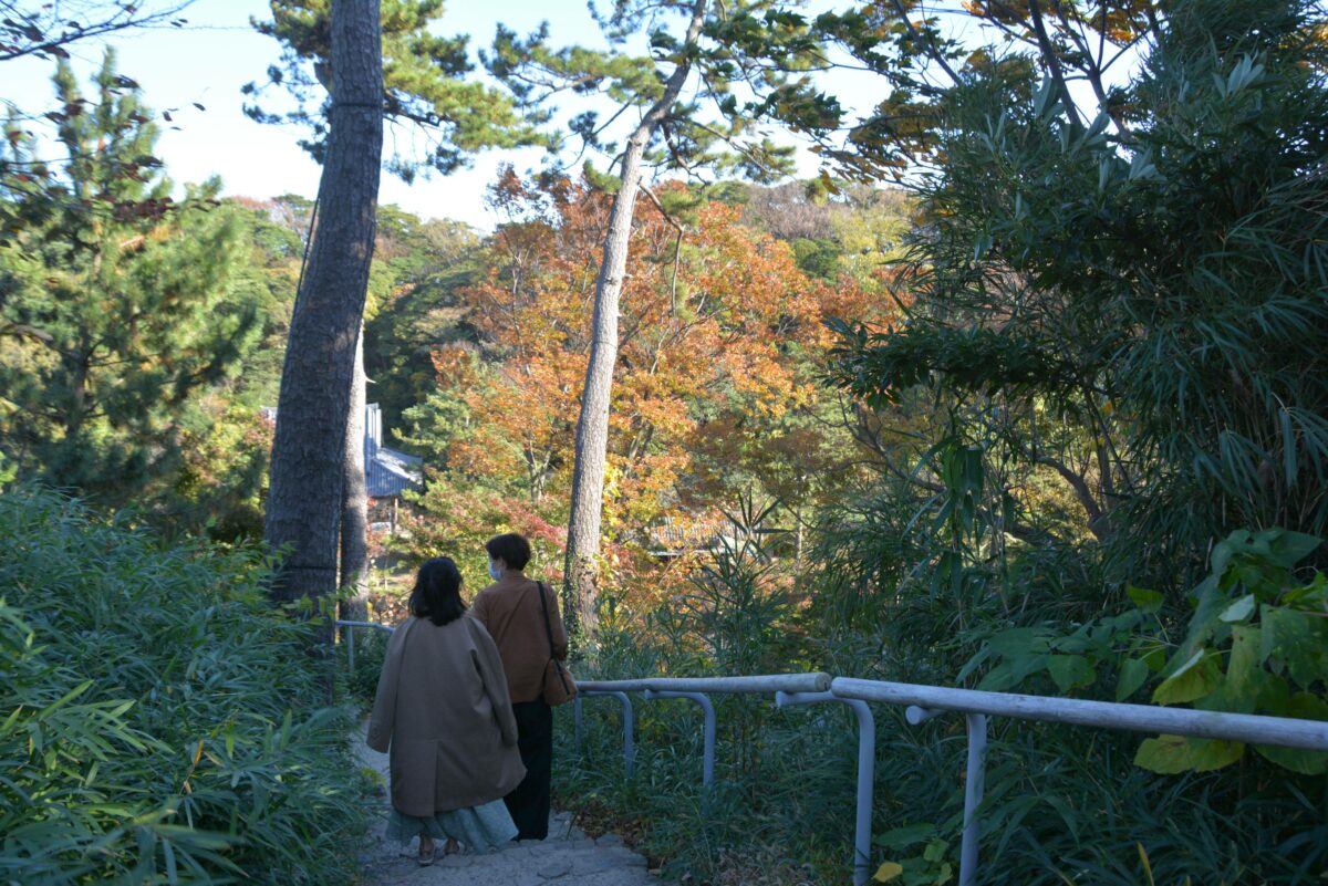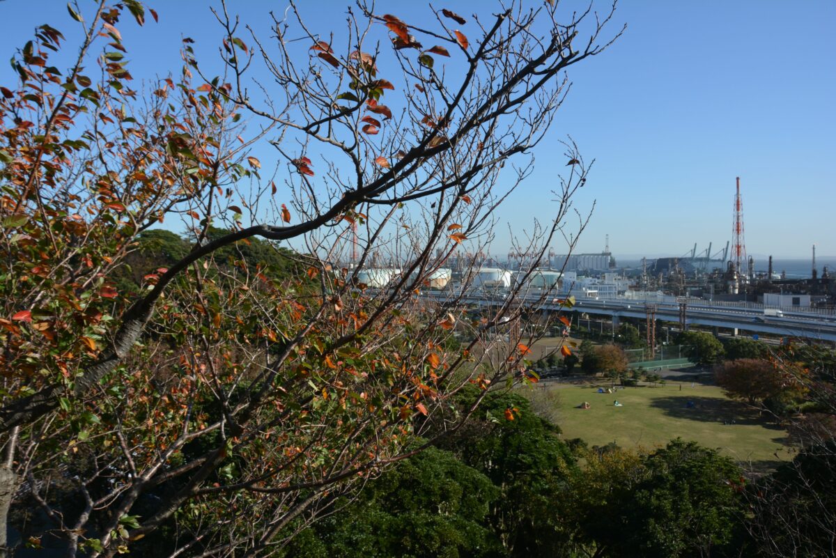 旧燈明寺三重塔の南の松風閣からは、紅葉越しに横浜港の姿を見下ろすことができます。