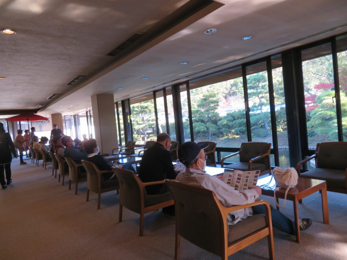 大池の南西の畔に設けられた三溪記念館では、三溪園を開いた原富太郎に関する資料や自筆の書画が展示されています。解放感が漲るロビーからは腰をかけて窓越しの紅葉を楽しむことができます。