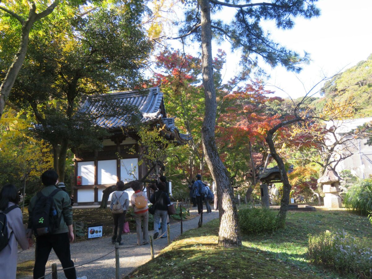 一方で旧天瑞寺寿塔覆堂の北はモミジの紅葉で彩られ、紅葉と黄葉がステレオ・カラーで堂を彩ります。