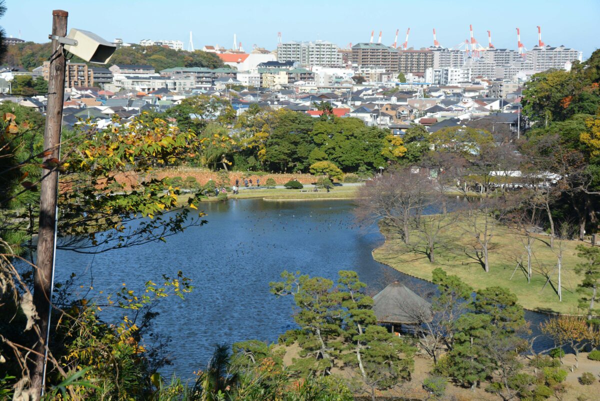 大池の南の小高い丘の上には旧燈明寺三重塔が聳えています。1457年に京都の木津川市に建造された塔は、三溪園に移築された建造物の中で最も古いものです。塔の下からは三溪園の全景の先に横浜の市街地が広がります。