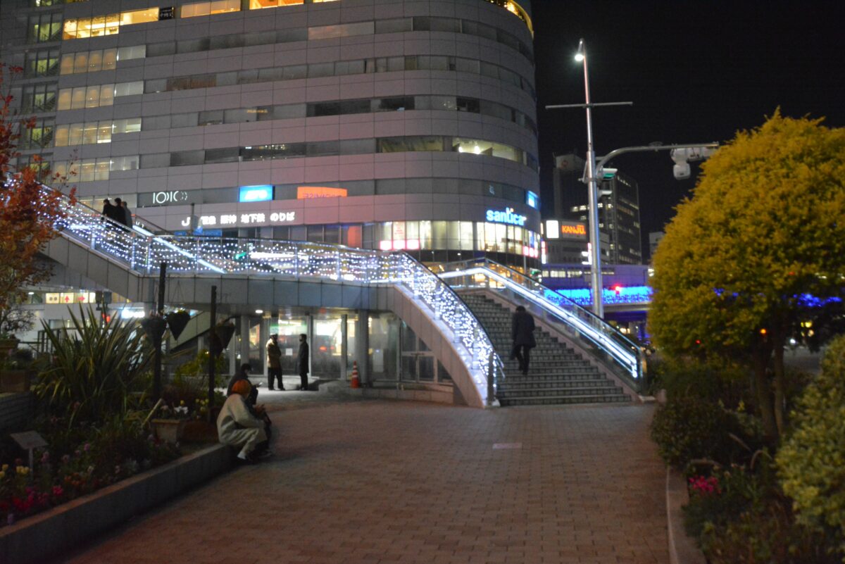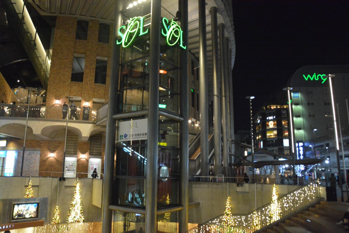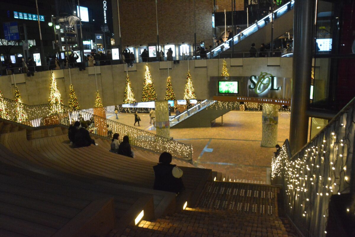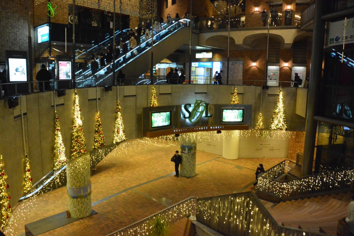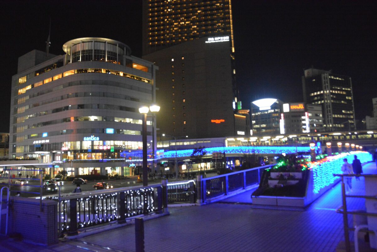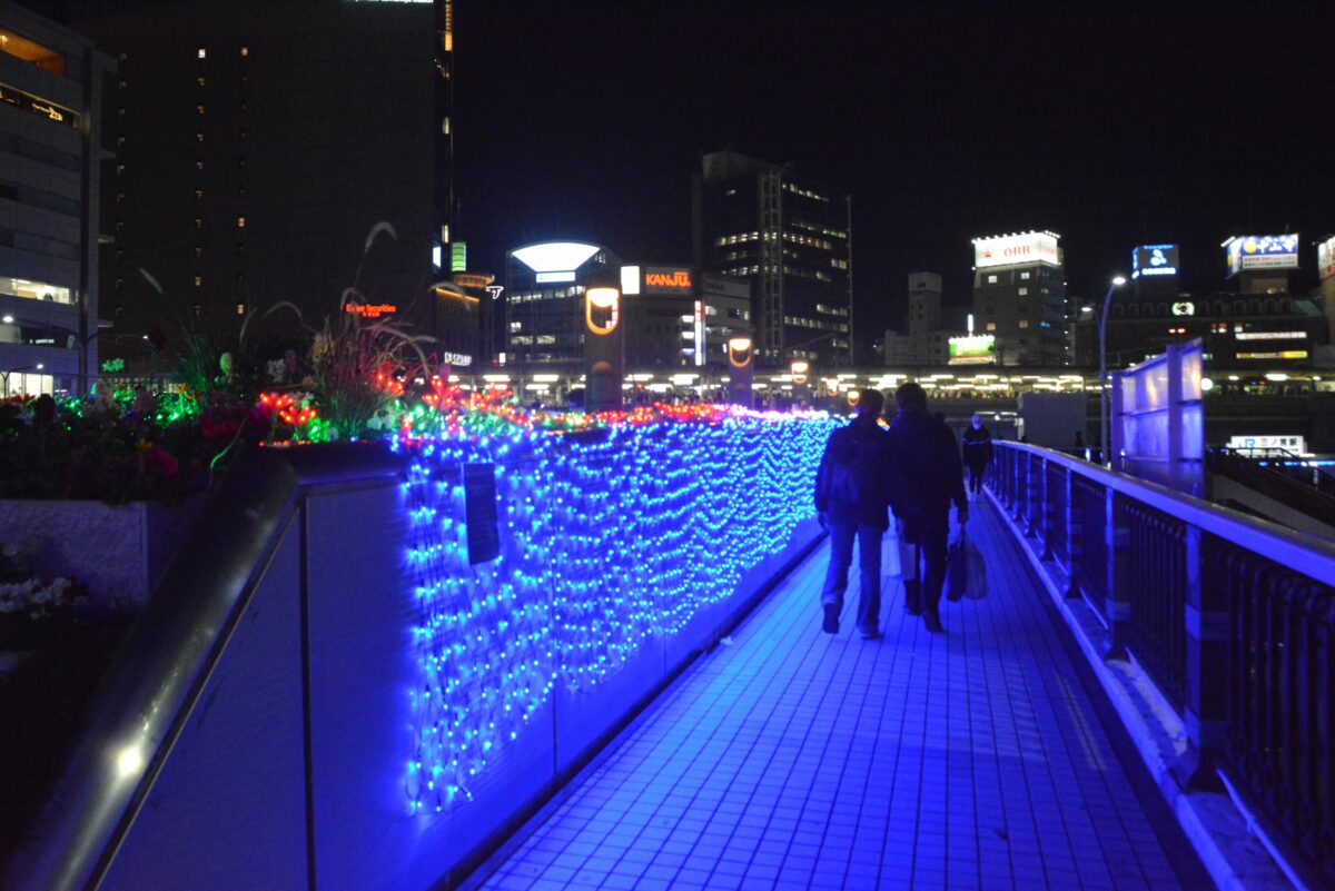 神戸市の玄関となっている三宮の駅前では、鉄道各線を歩道橋のコリドーが繋いでいます。2021年は11月19日~12月25日の期間で「コウベ・ライト・メッセージ」が行われ、コリドーに光の道しるべが灯されます。