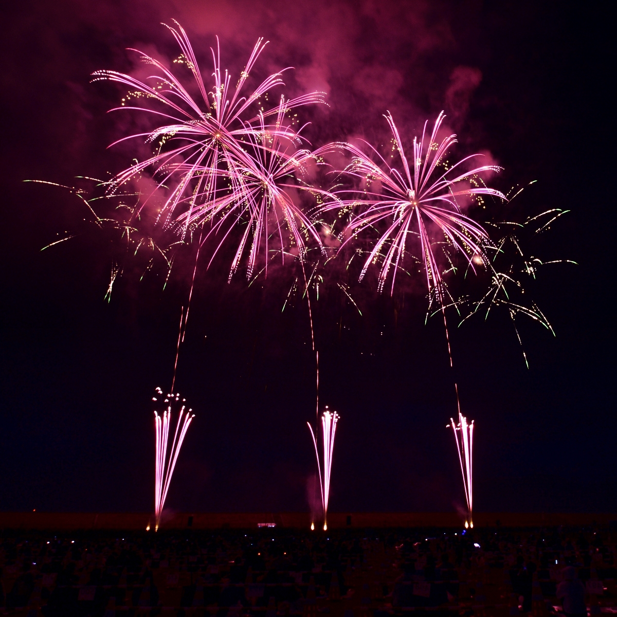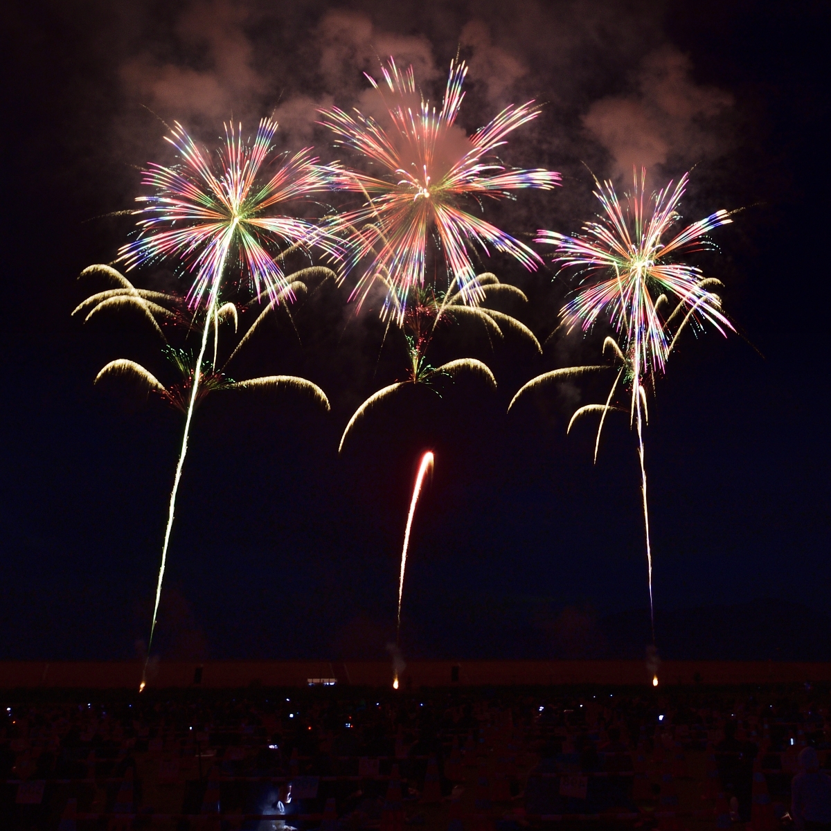 分砲のパステルがあまりにも美しい!!花火の発色の良さは、笑いが止まらない感激です。リズミカルに光が移動するグラデーションが、見ている人全てを元気にさせてくれる最高のエールでした。