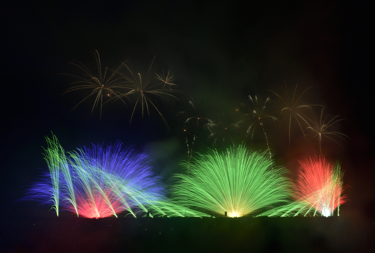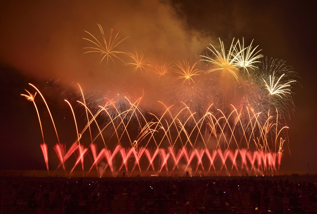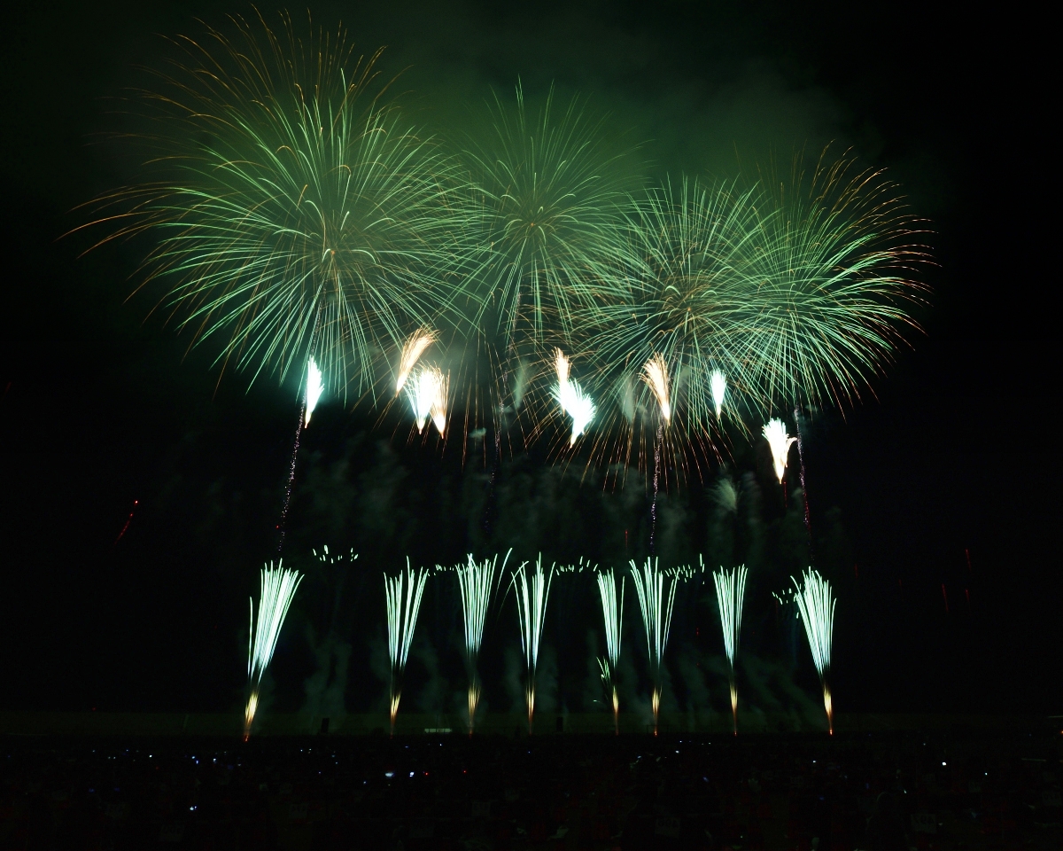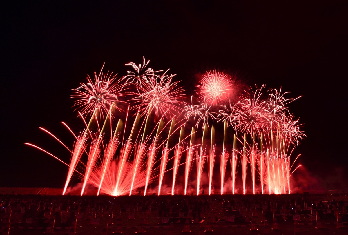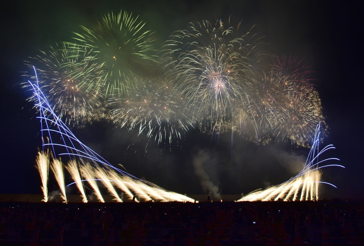 全編、音楽にシンクロしたミュージックスターマインで構成されており、広々とした会場だからこそ実現できる演出がたくさん。地表から色光が吹き出す「ザラ」を駆使して、圧倒的な疾走感が迫ります。