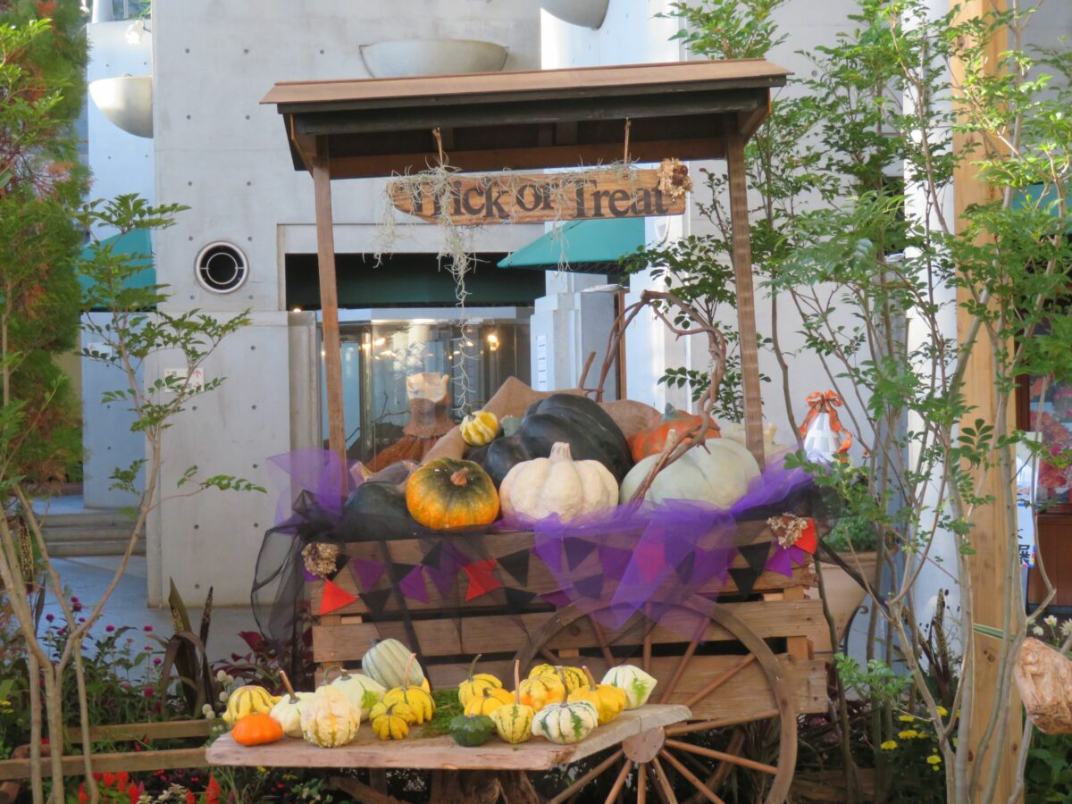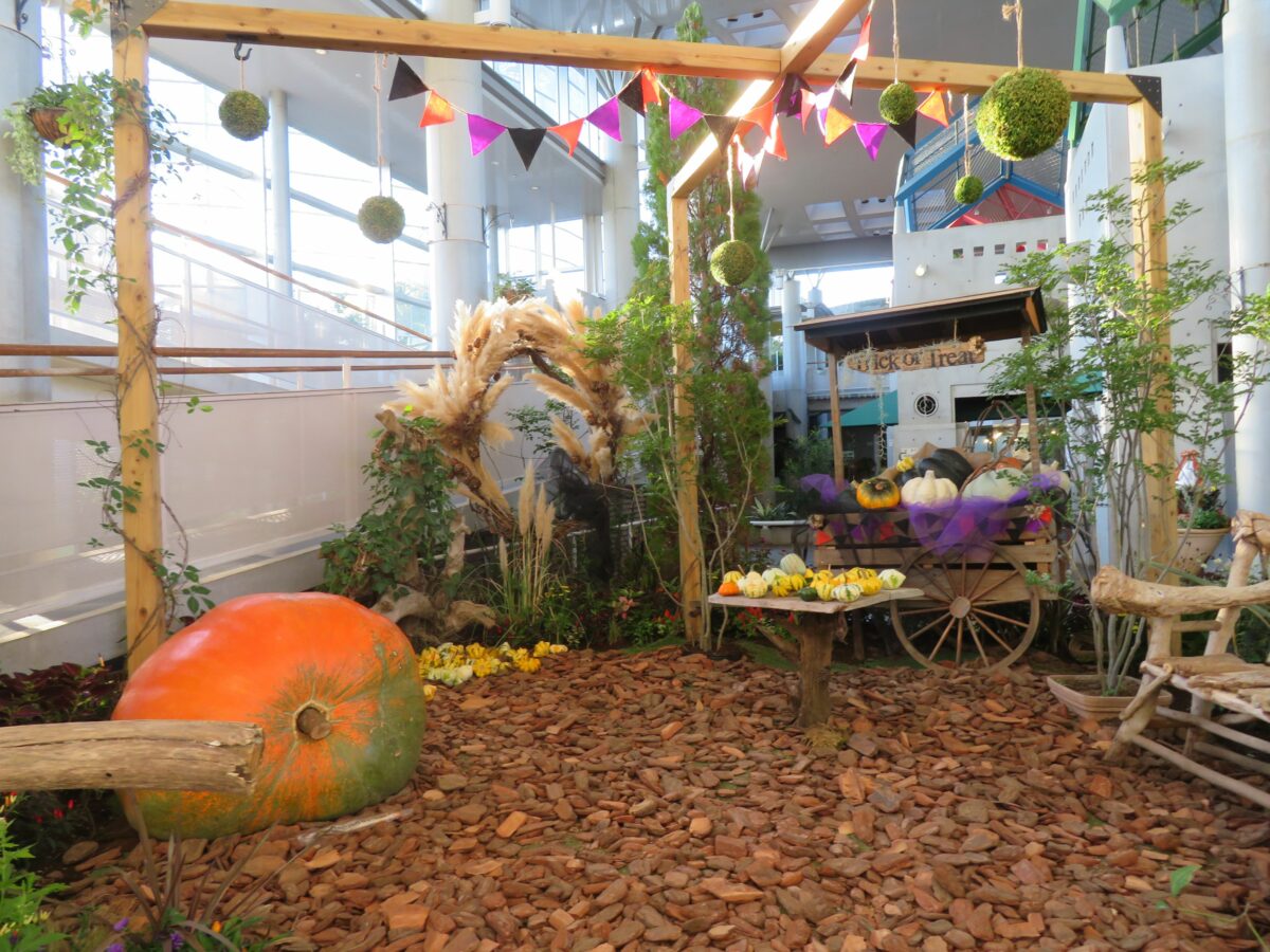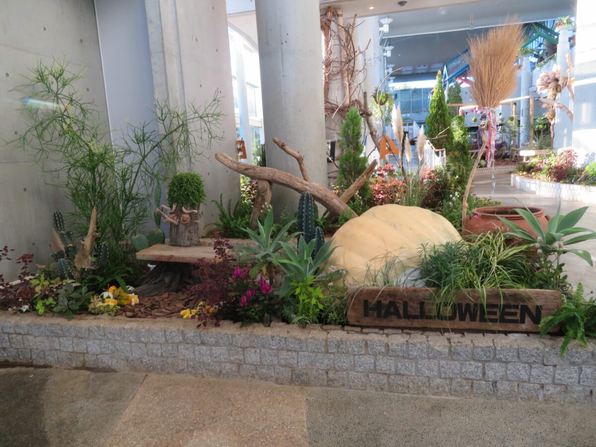 展示棟の玄関前のホールは、「ジャック・オー・ランタン」を中心として、個性豊かなオブジェがハロウィンを祝っているかのようです。