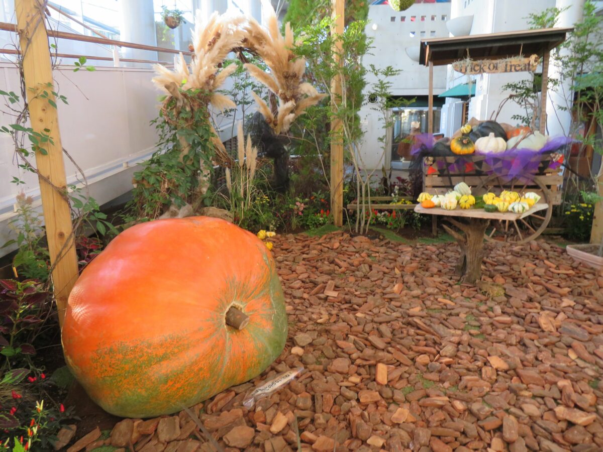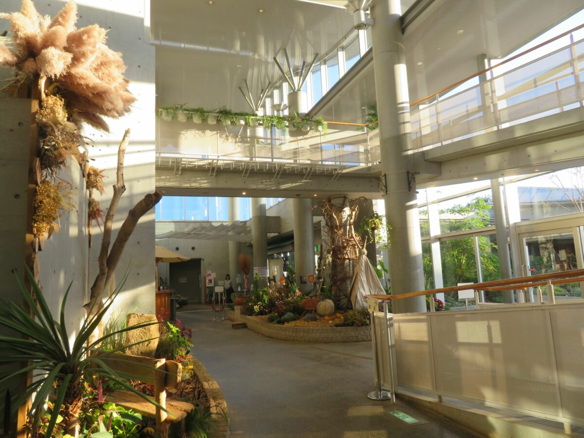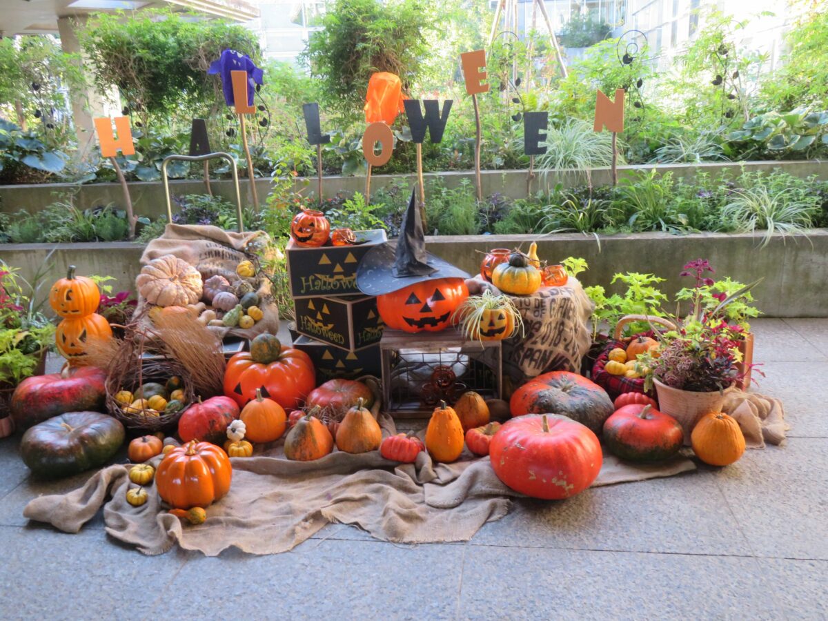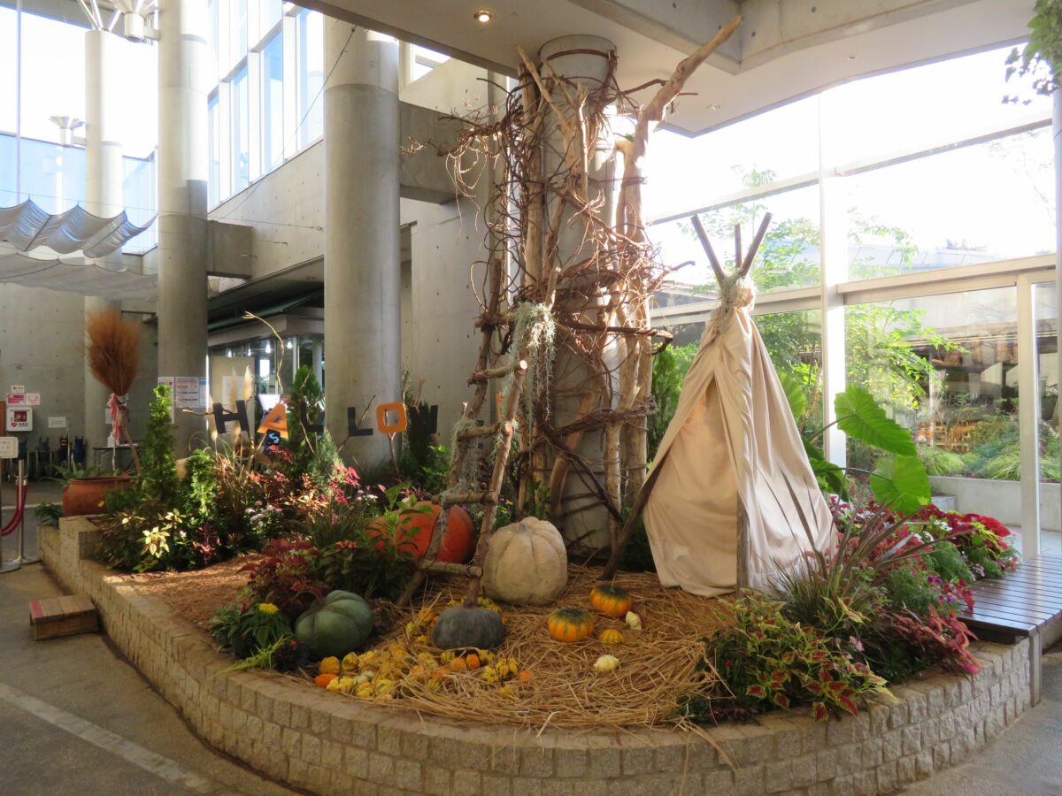 展示棟の玄関前のホールは、「ジャック・オー・ランタン」を中心として、個性豊かなオブジェがハロウィンを祝っているかのようです。