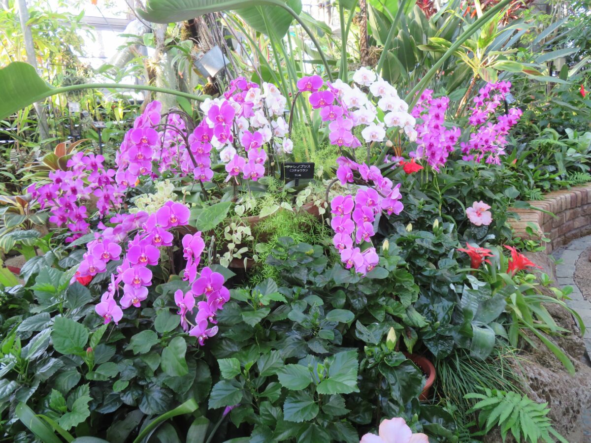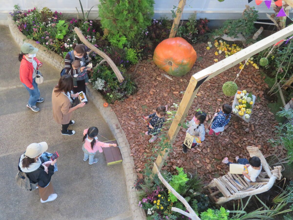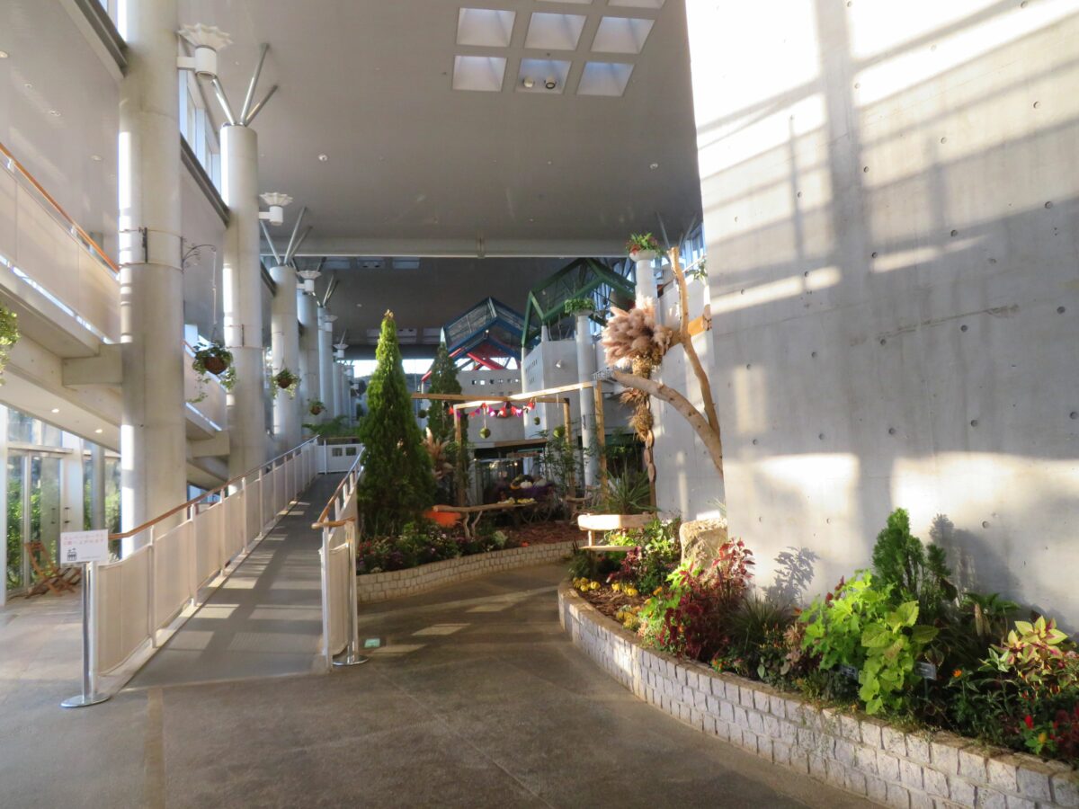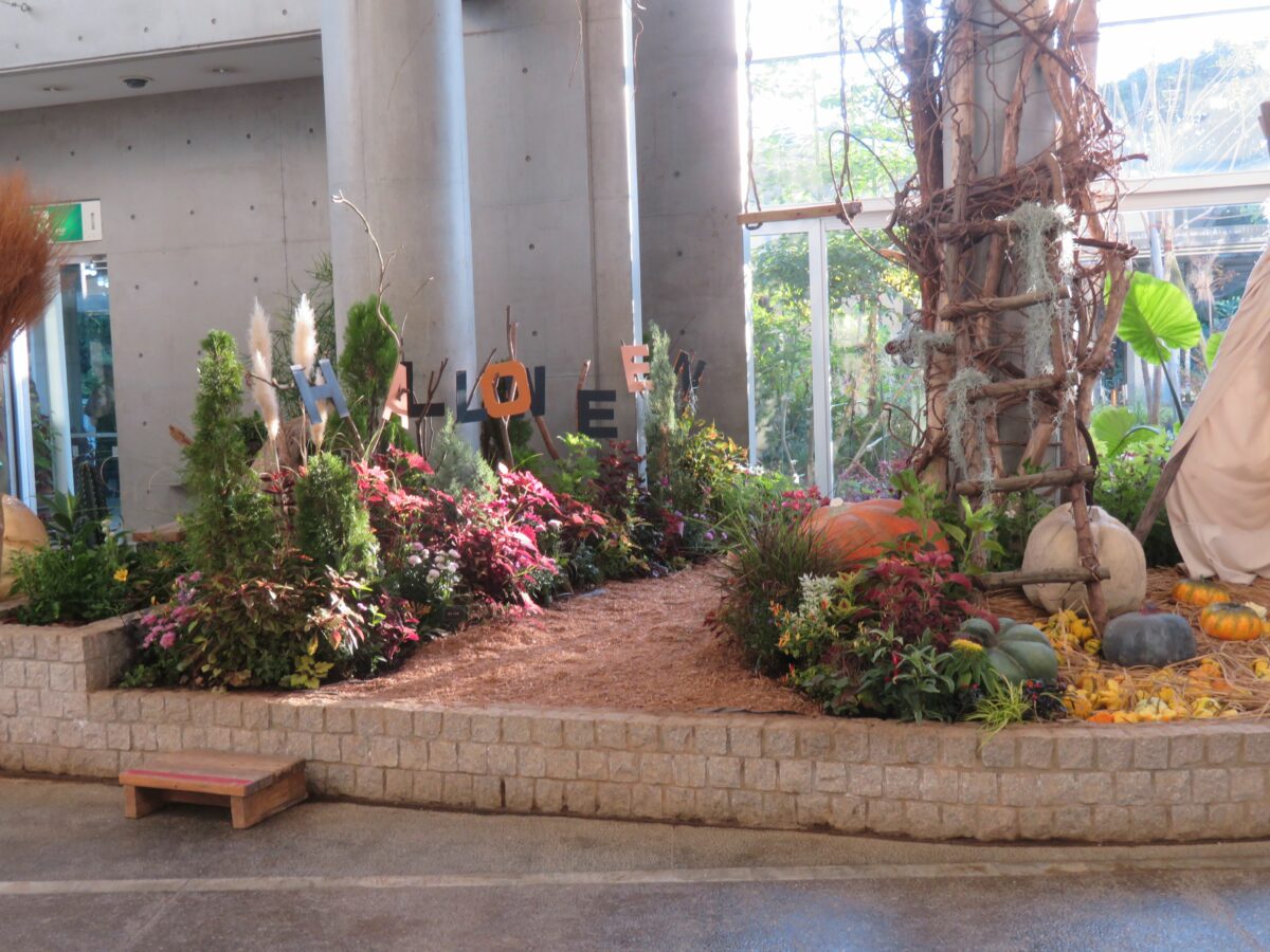 「ハッピーハロウィン」の期間中は、展示棟内は隅々までハロウィンのムードが漲りますが、併設の温室棟をはじめ館内には多種多様の花が互いに彩りを競っています。