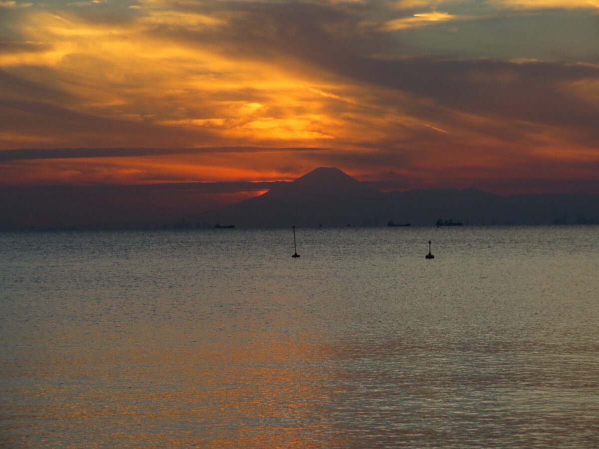 東京湾越しに浮かぶ富士山をかすめて沈む夕陽
