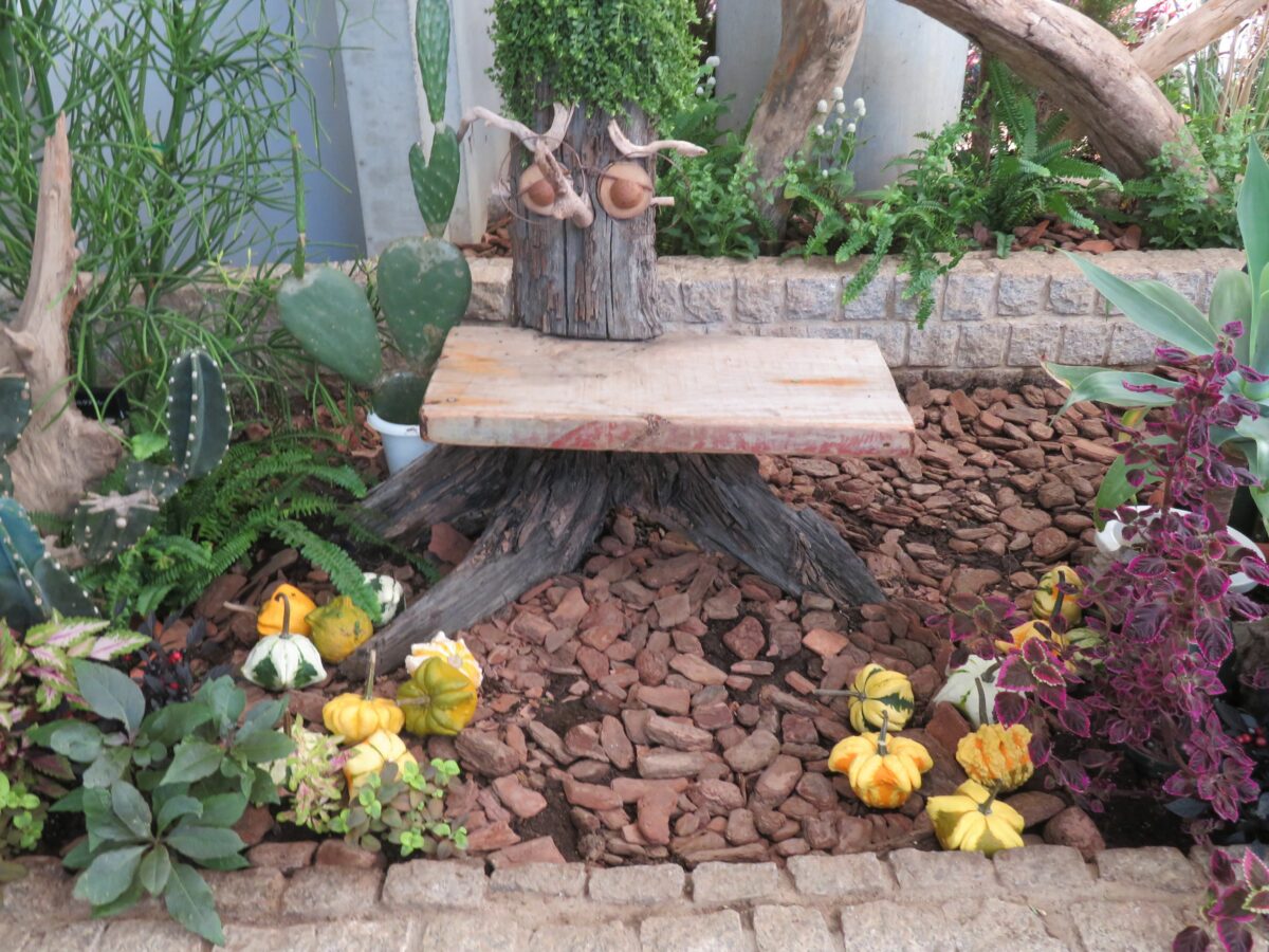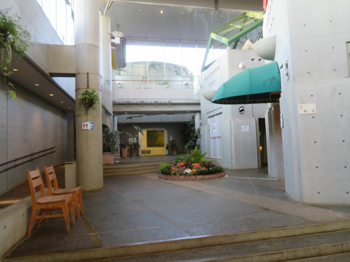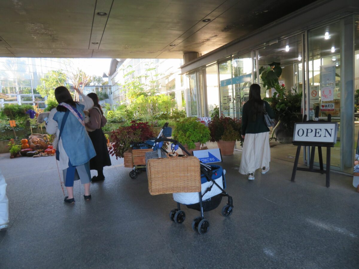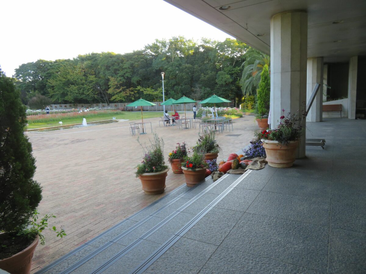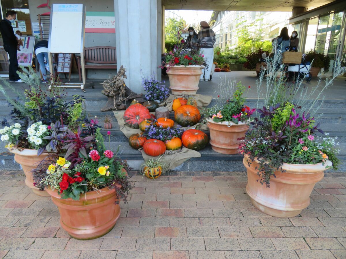 前庭が展示棟に接するエリアには噴水が設置され、水しぶきの中央ではカボチャや季節の花がアート作品を創り上げているようです。